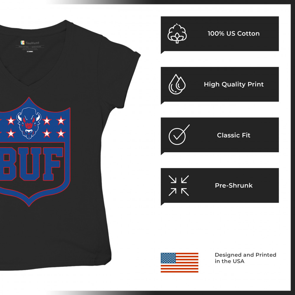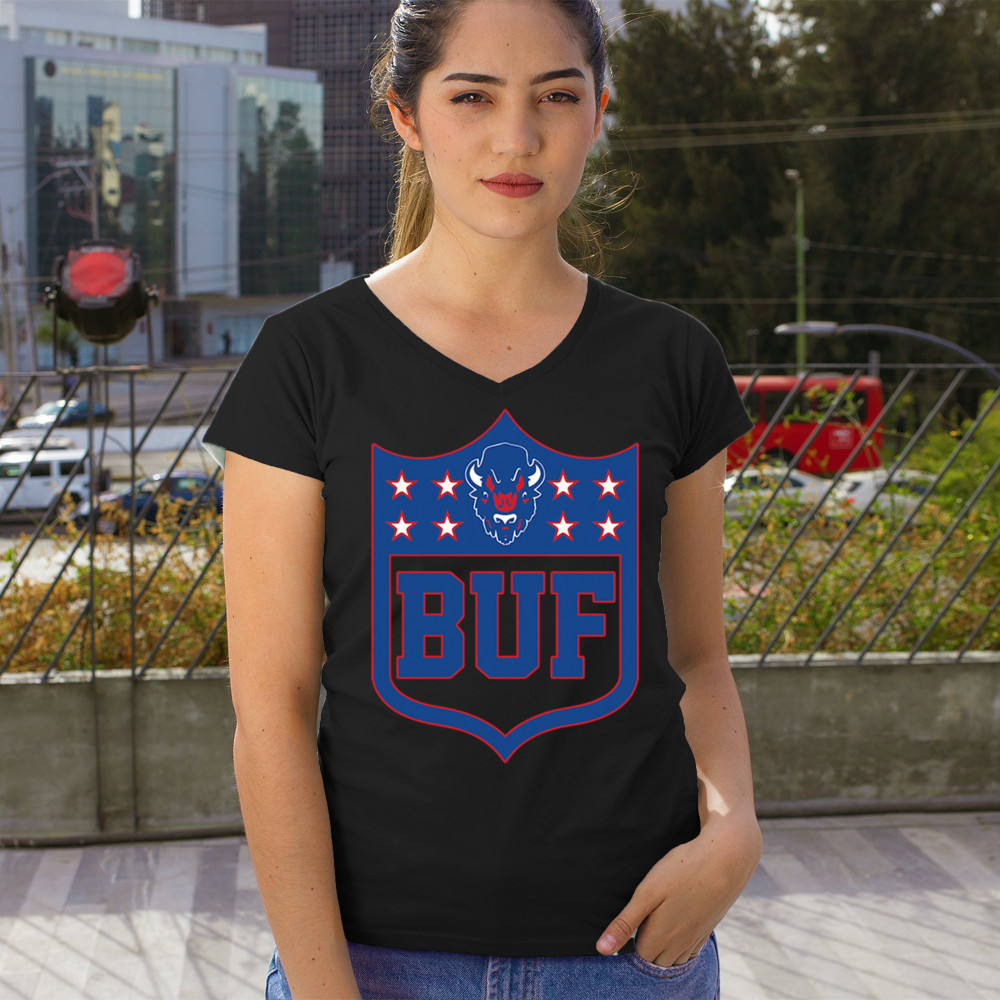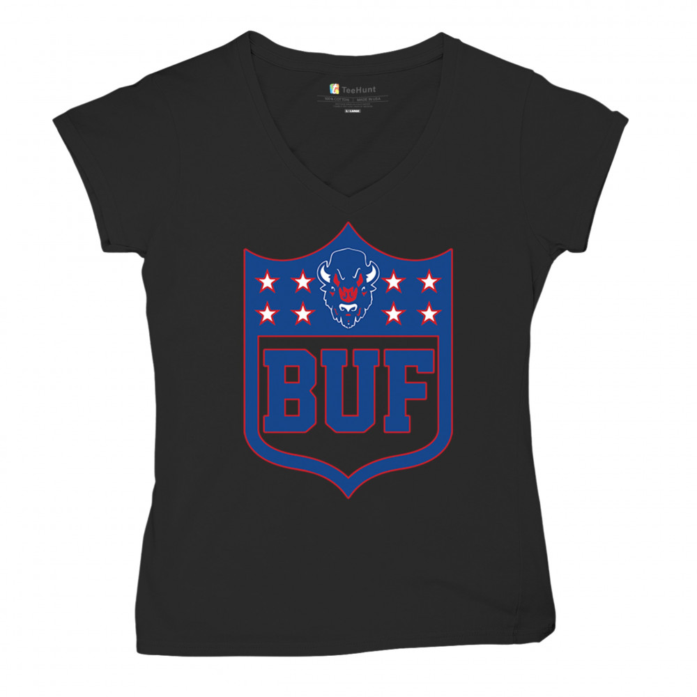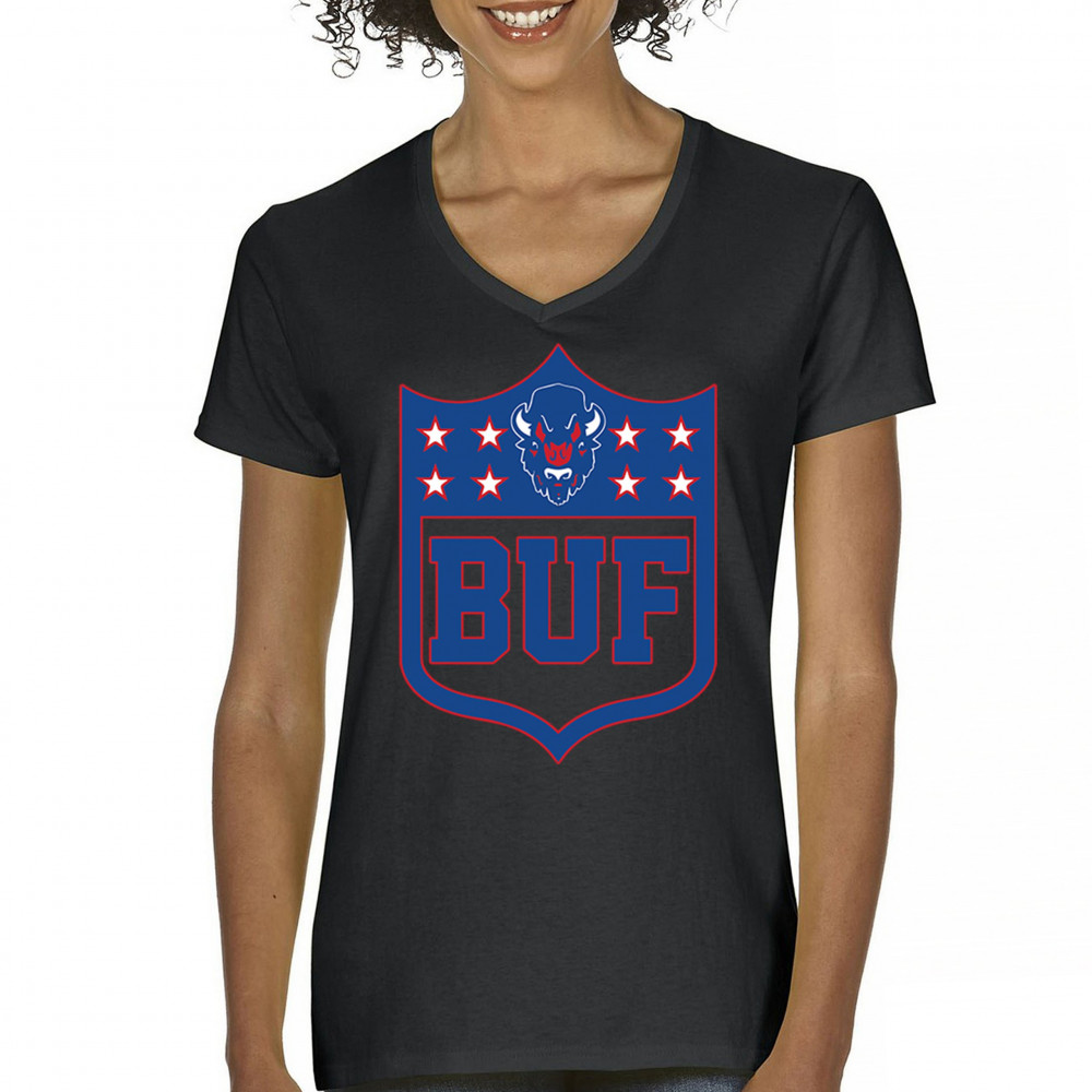 BUFFALO SHIELD women's v-neck t-shirt game night fantasy football fan tailgate black