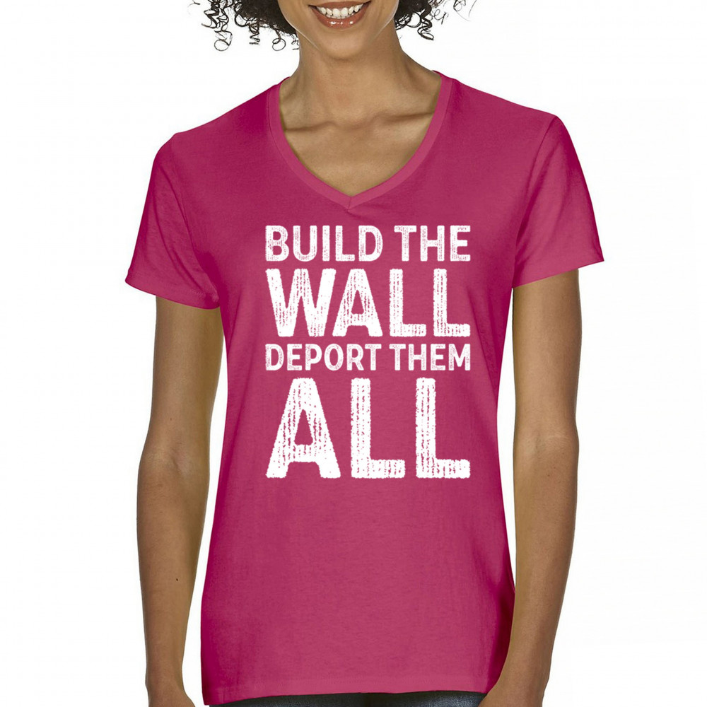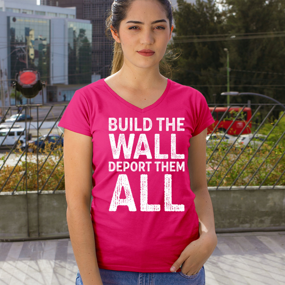 Stand strong for border security with our 'Build the Wall Deport Them All Trump 2024' tee. As a proud Trump supporter, join the America First movement and champion conservative values. Trust in God, not government, and reject the failed policies of Sleepy Joe. Let's go Brandon! Let the American flag wave high as we rally for victory in 2024.