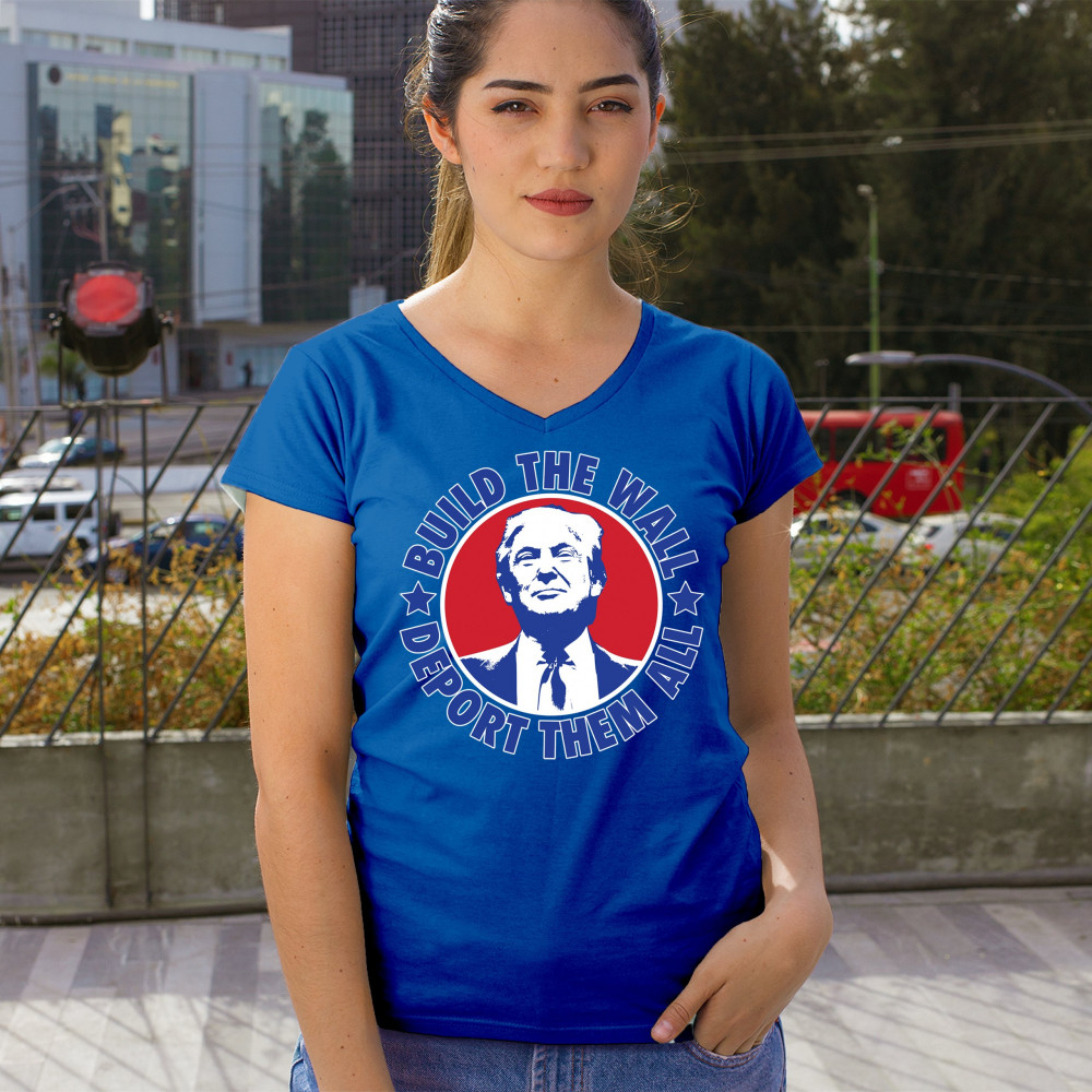 Showcase your unwavering support with a bold design that champions America first. Featuring the "Build the Wall Deport Them All Trump 2024" message, this piece is a must-have for conservatives, symbolizing trust in God over government, and a commitment to never surrender. Adorned with the American flag and a call to rebelution, it's perfect for any Trump supporter ready to stand against the tide.
