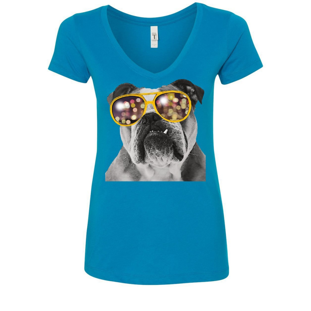 BULLDOG WEARING GLASSES women's v-neck t-shirt cute dog swag pet lovers urban turquoise