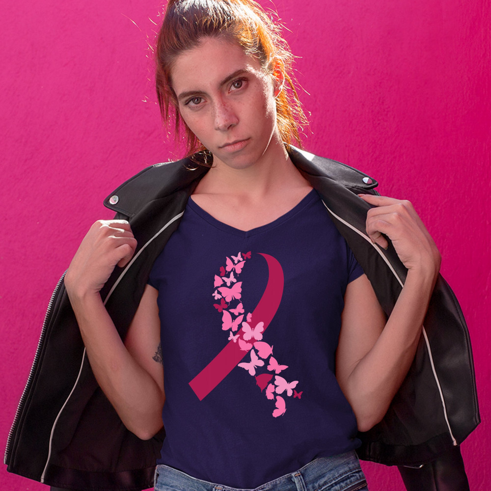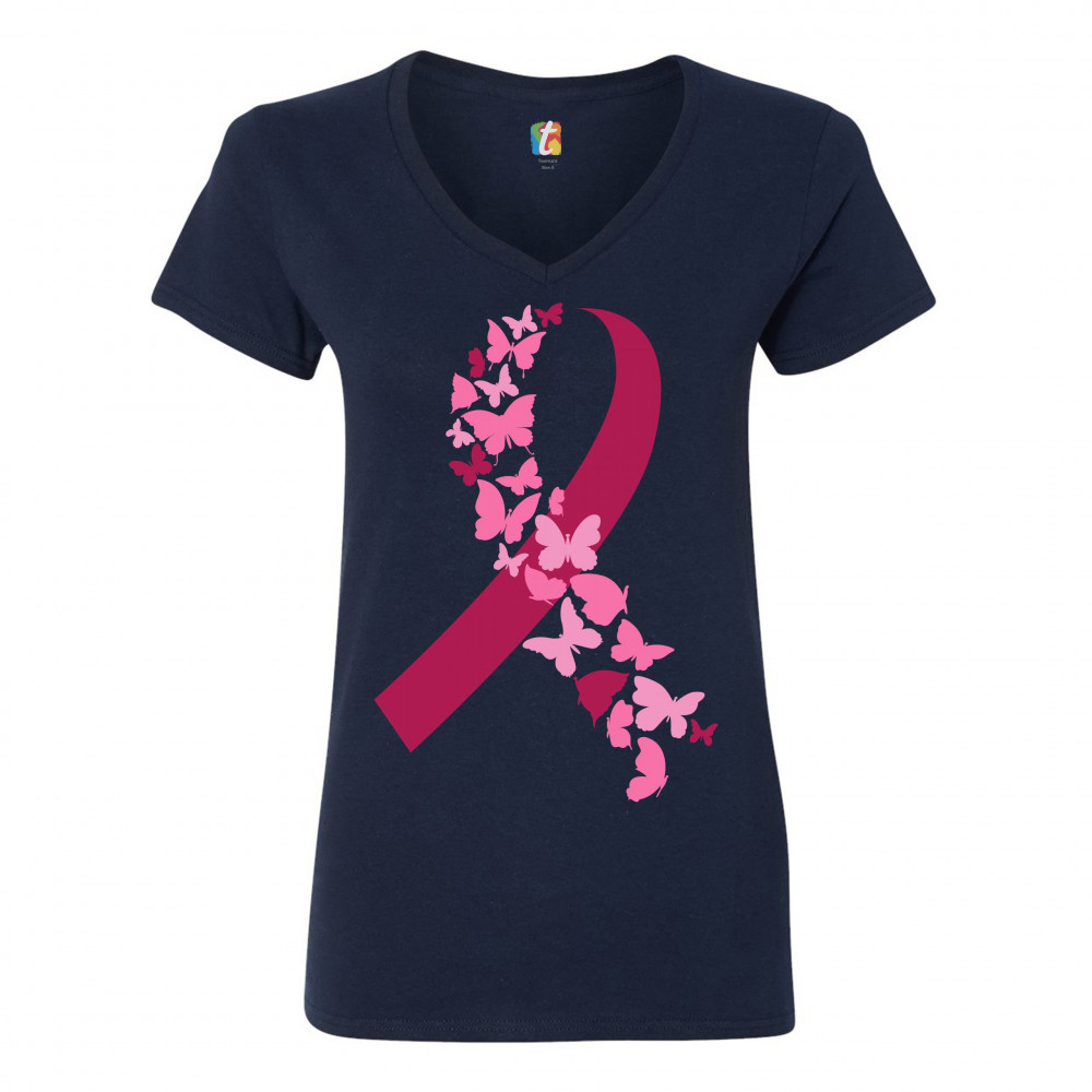 BUTTERFLIES PINK RIBBON women's v-neck t-shirt breast cancer awareness tee navy blue