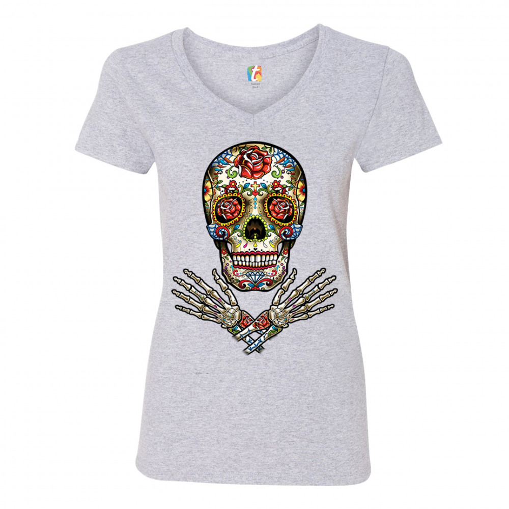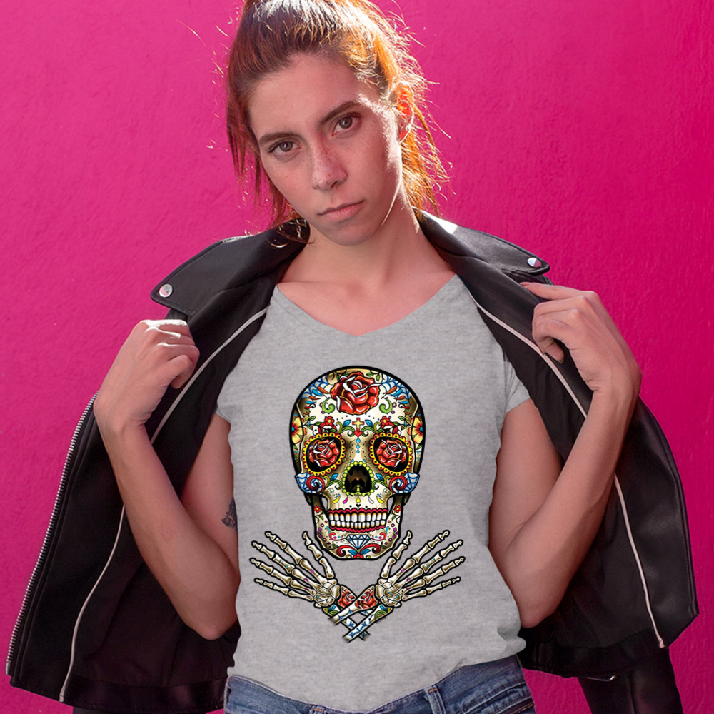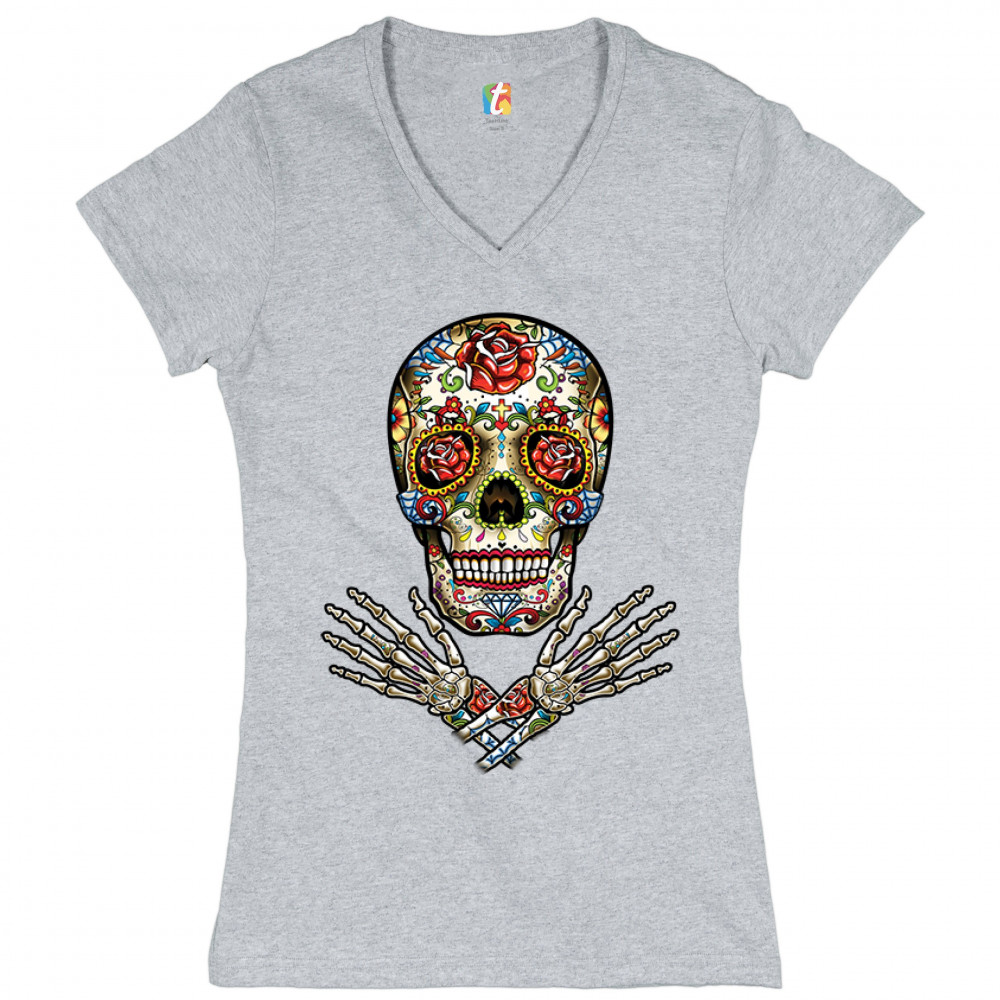 CALAVERA ARMS CROSSED calavera women's v-neck t-shirt dia de los muertos day of the dead tee gray