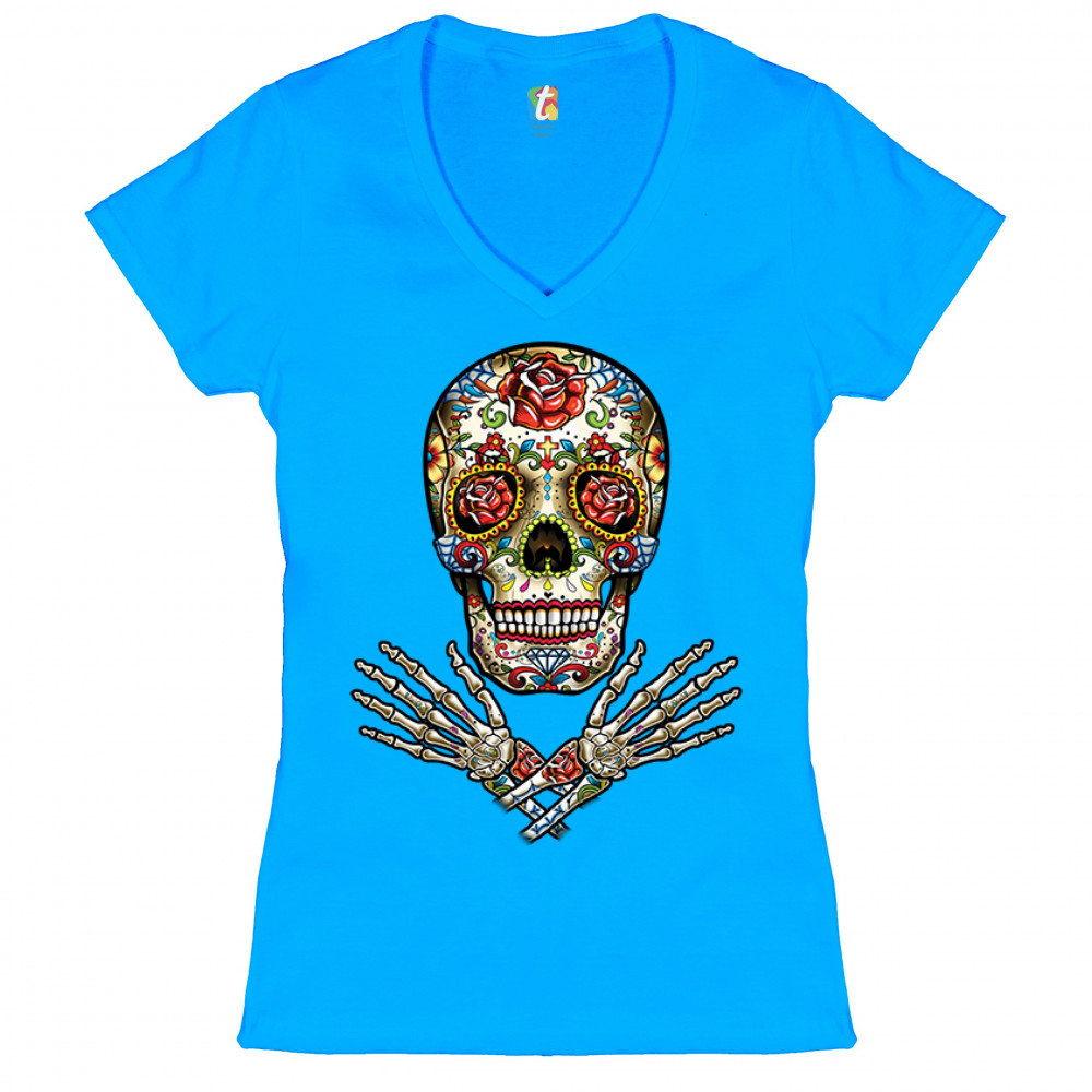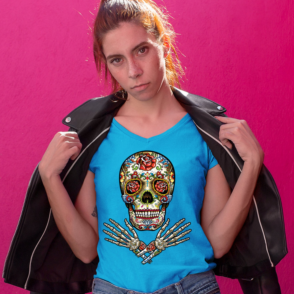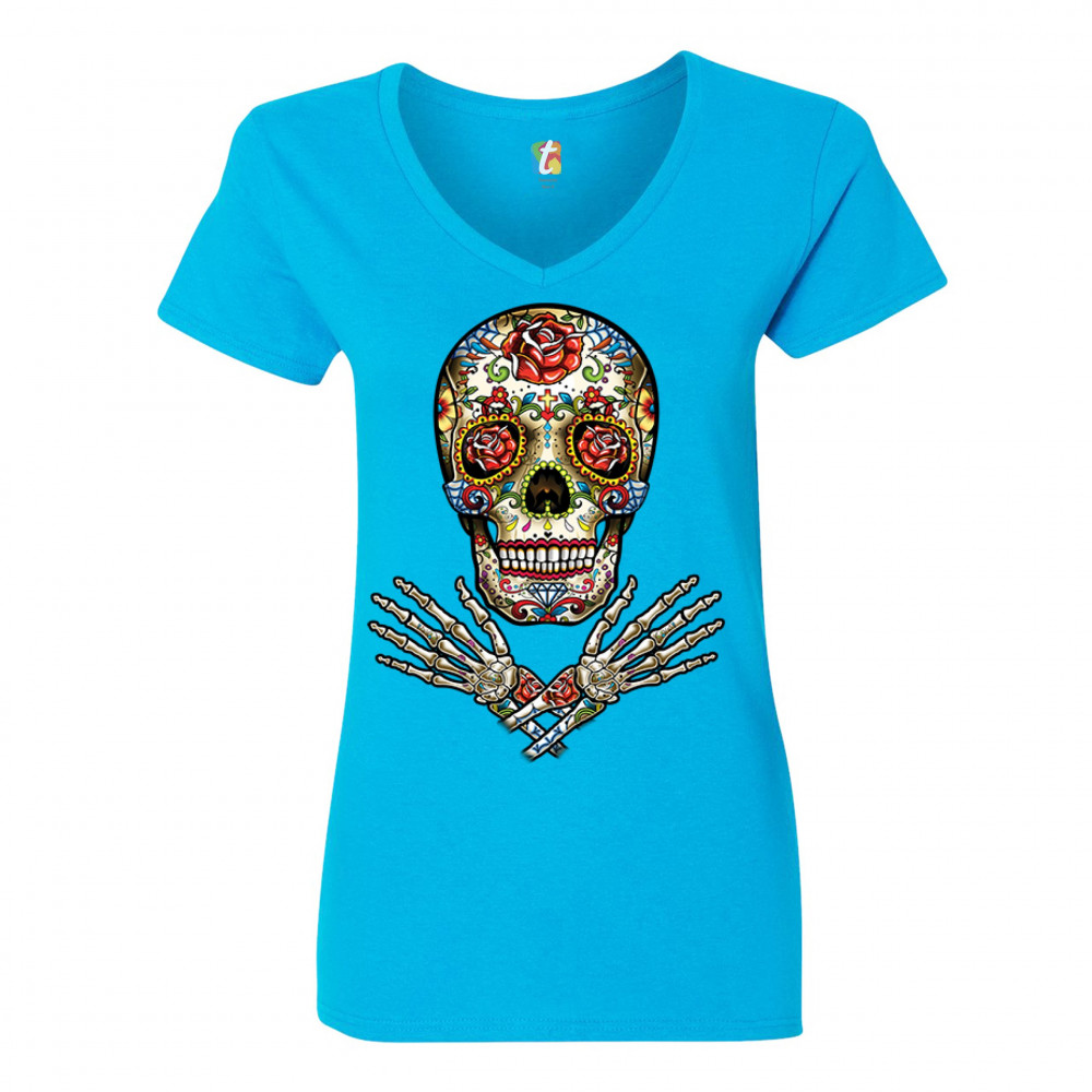 CALAVERA ARMS CROSSED calavera women's v-neck t-shirt dia de los muertos day of the dead tee turquoise
