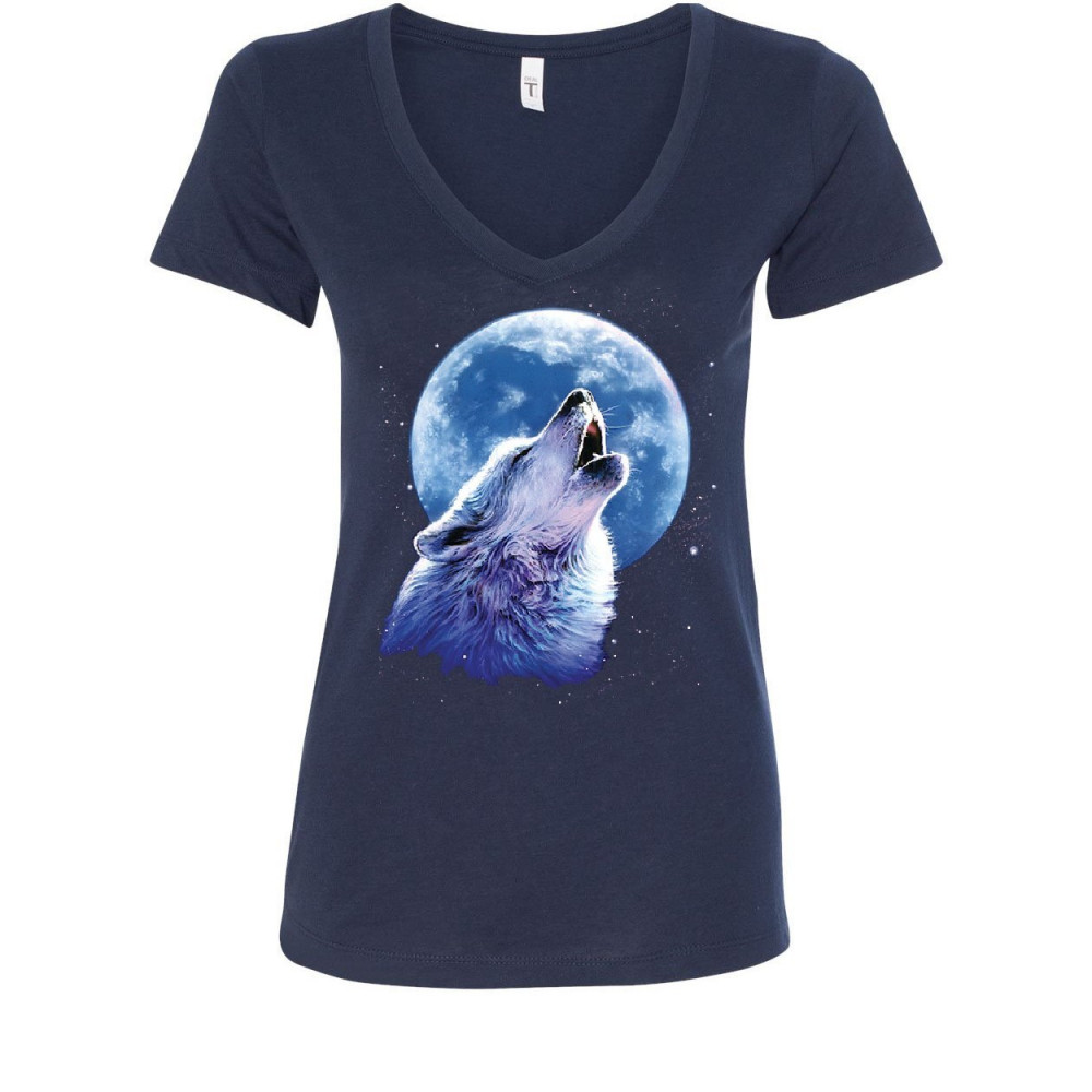 CALL OF THE WILD women's v-neck t-shirt lone wolf howling at the moon wildlife navy blue