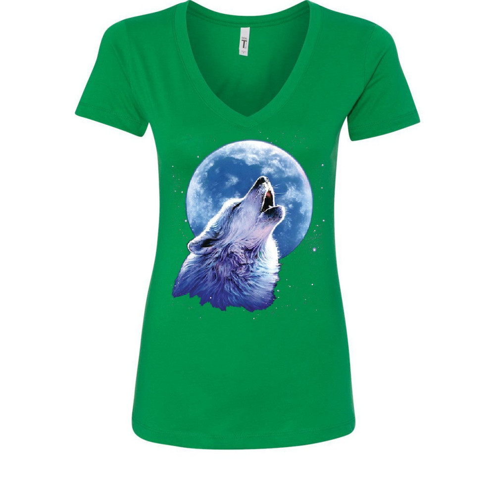 CALL OF THE WILD women's v-neck t-shirt lone wolf howling at the moon wildlife green