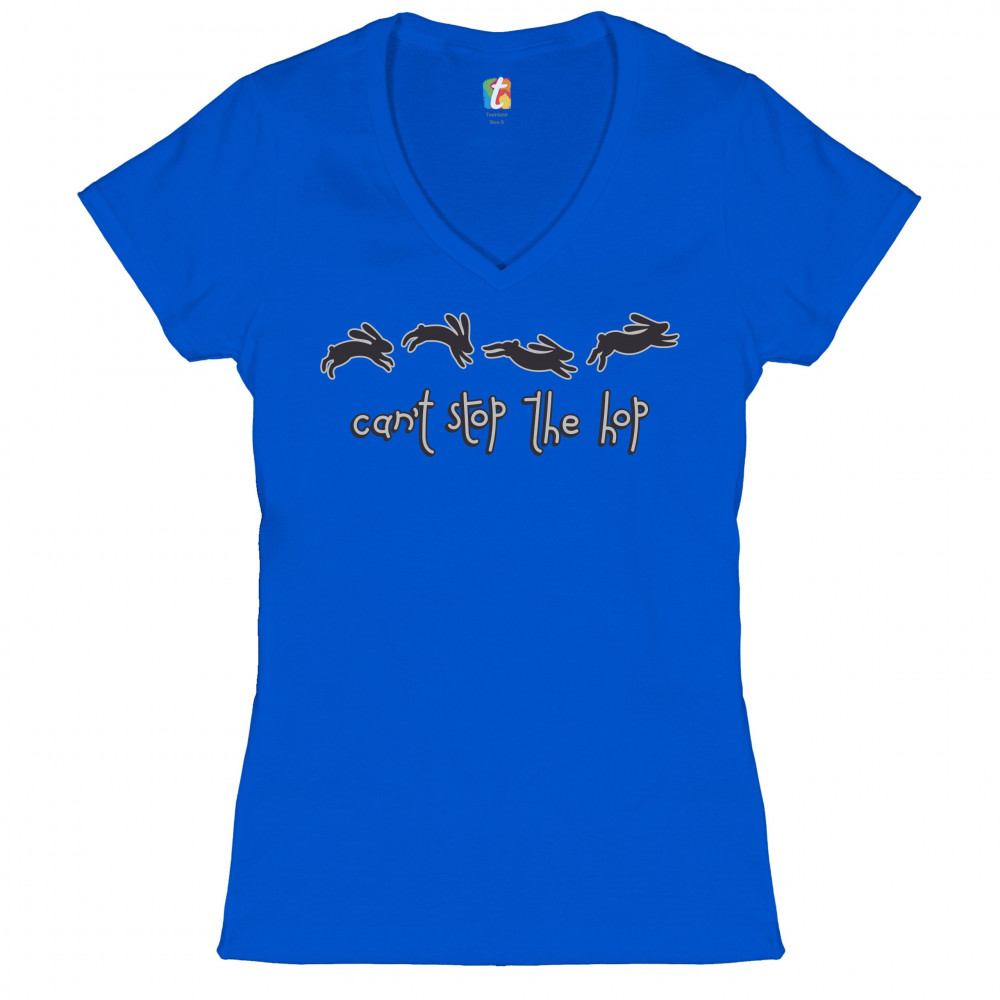 CAN'T STOP THE HOP women's v-neck t-shirt happy easter hopping rabbits tee royal blue