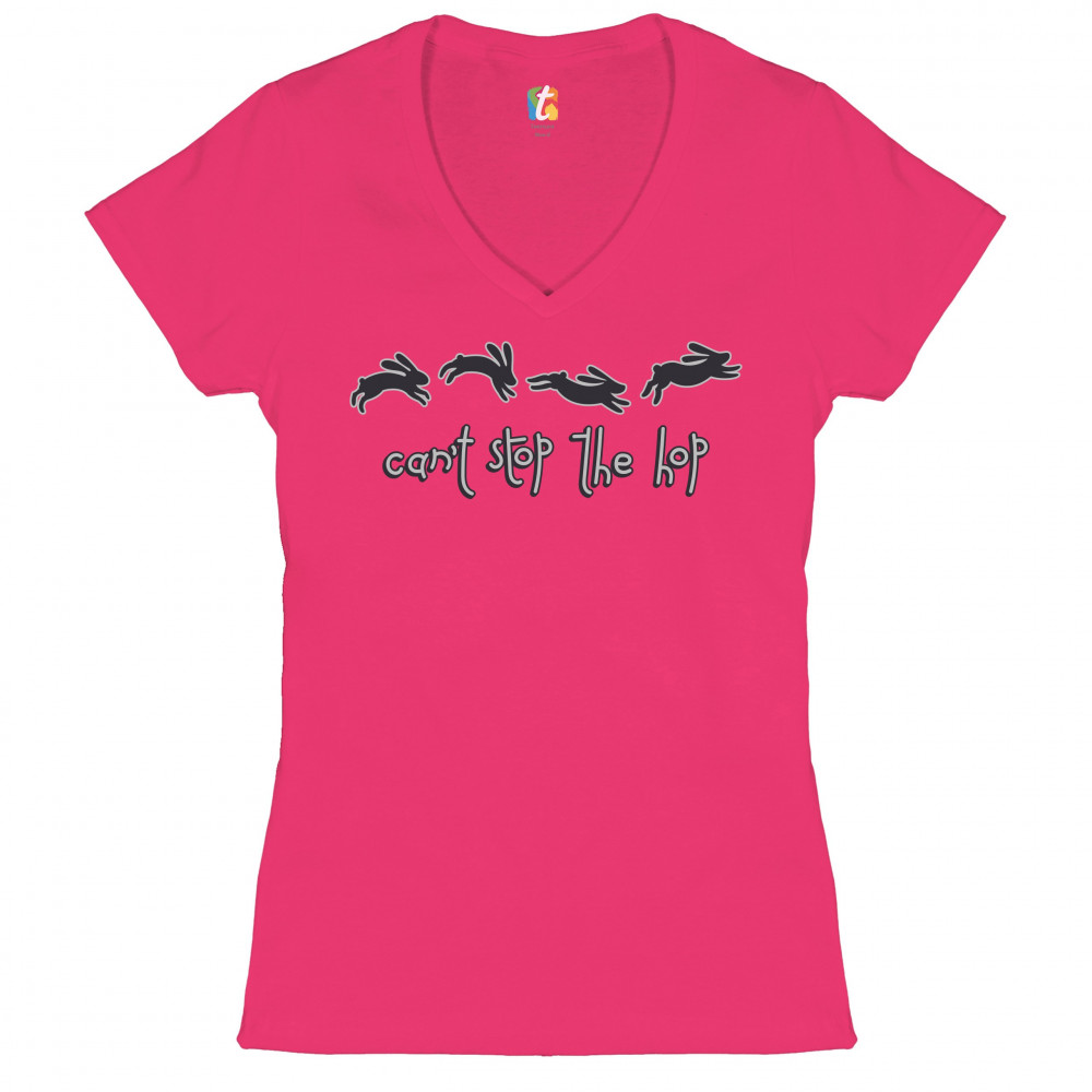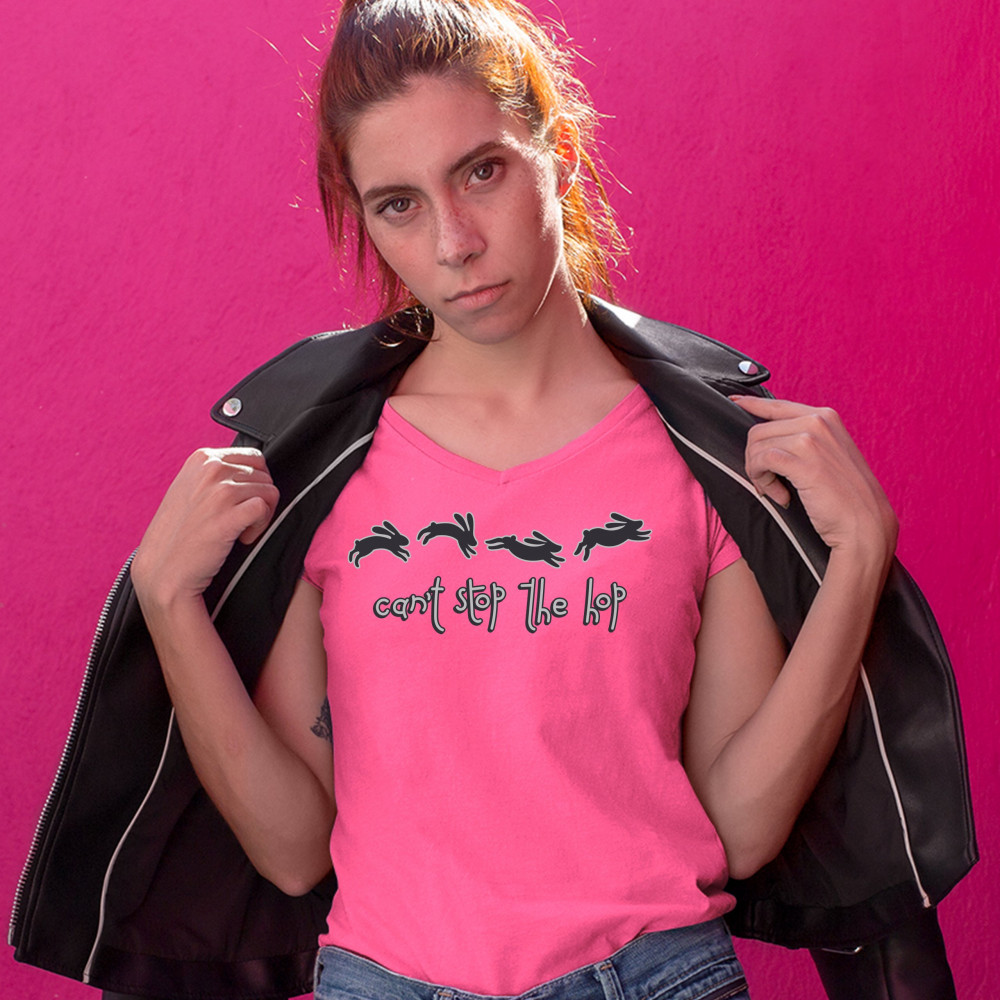 CAN'T STOP THE HOP women's v-neck t-shirt happy easter hopping rabbits tee pink