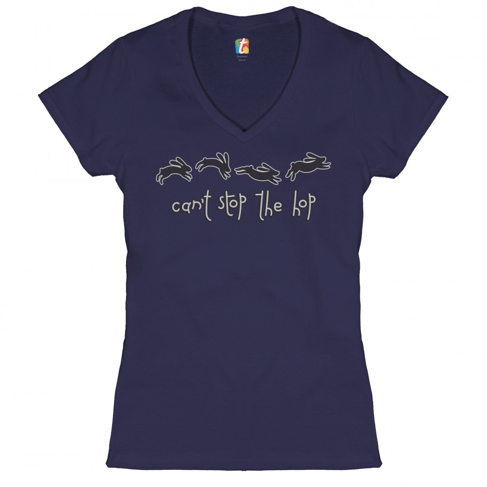CAN'T STOP THE HOP women's v-neck t-shirt happy easter hopping rabbits tee navy blue