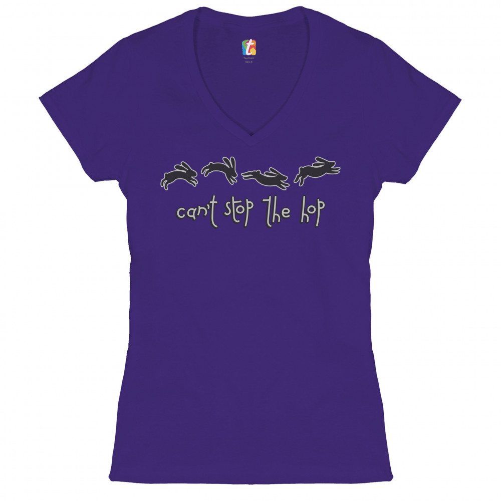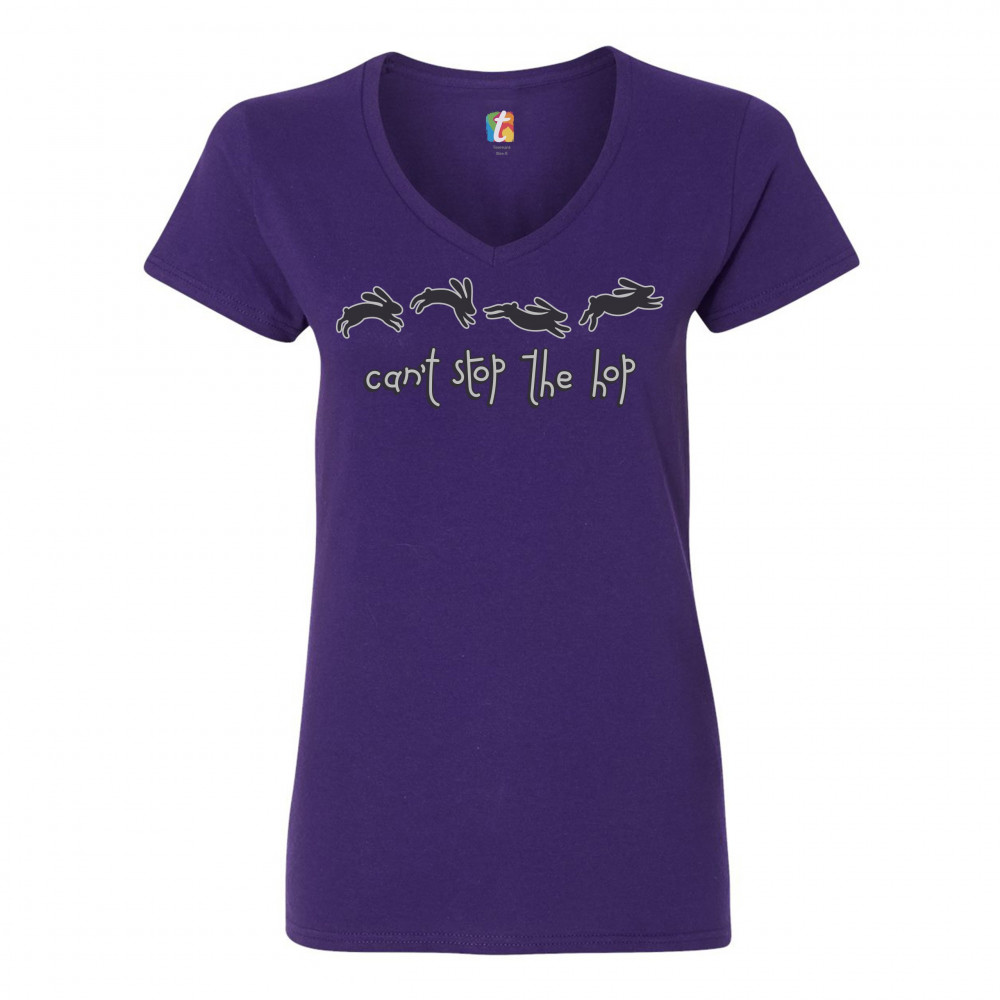 CAN'T STOP THE HOP women's v-neck t-shirt happy easter hopping rabbits tee purple