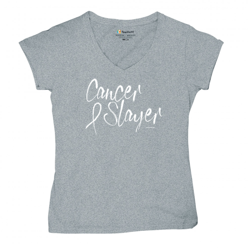 CANCER SLAYER women's v-neck t-shirt breast cancer awareness ribbon hope tee gray