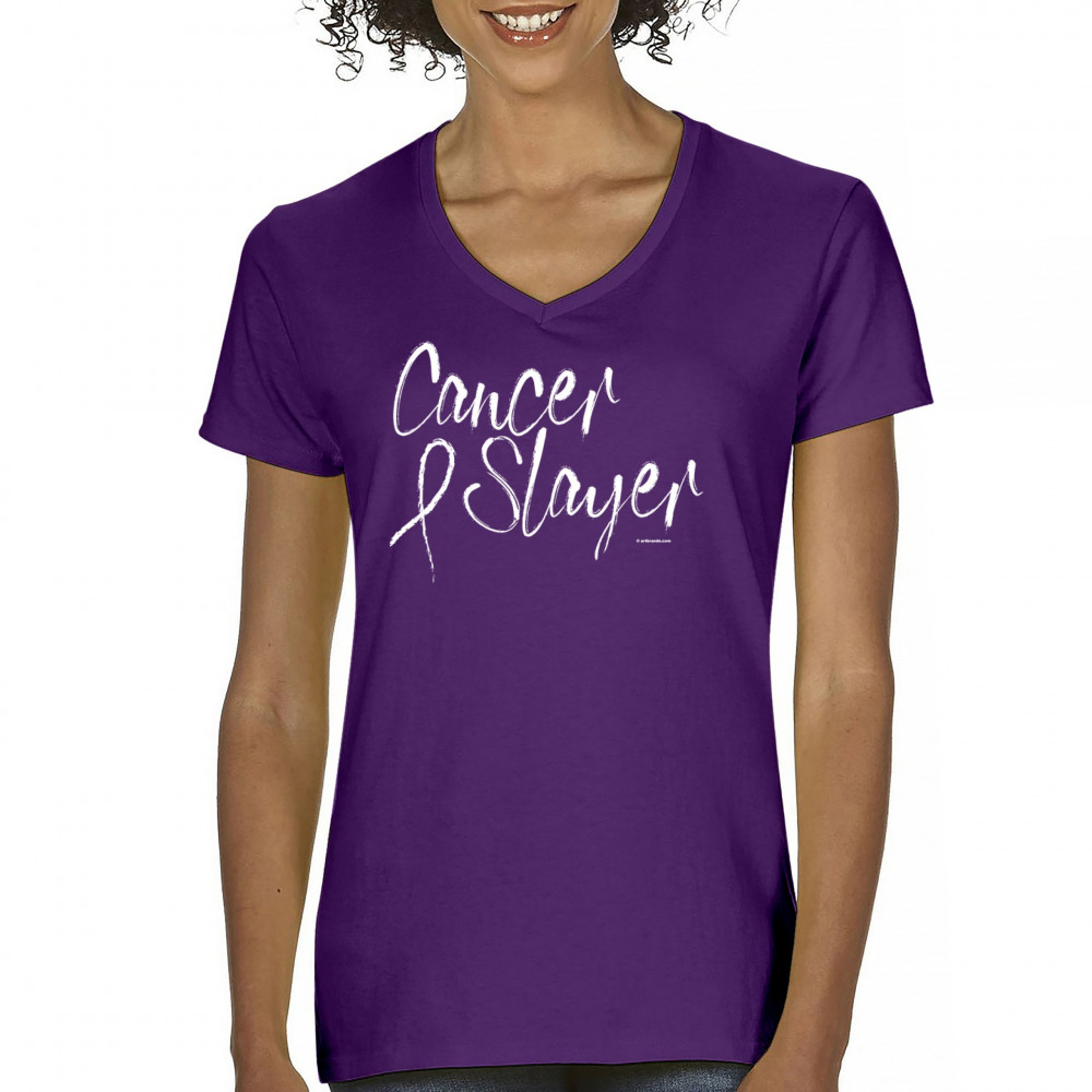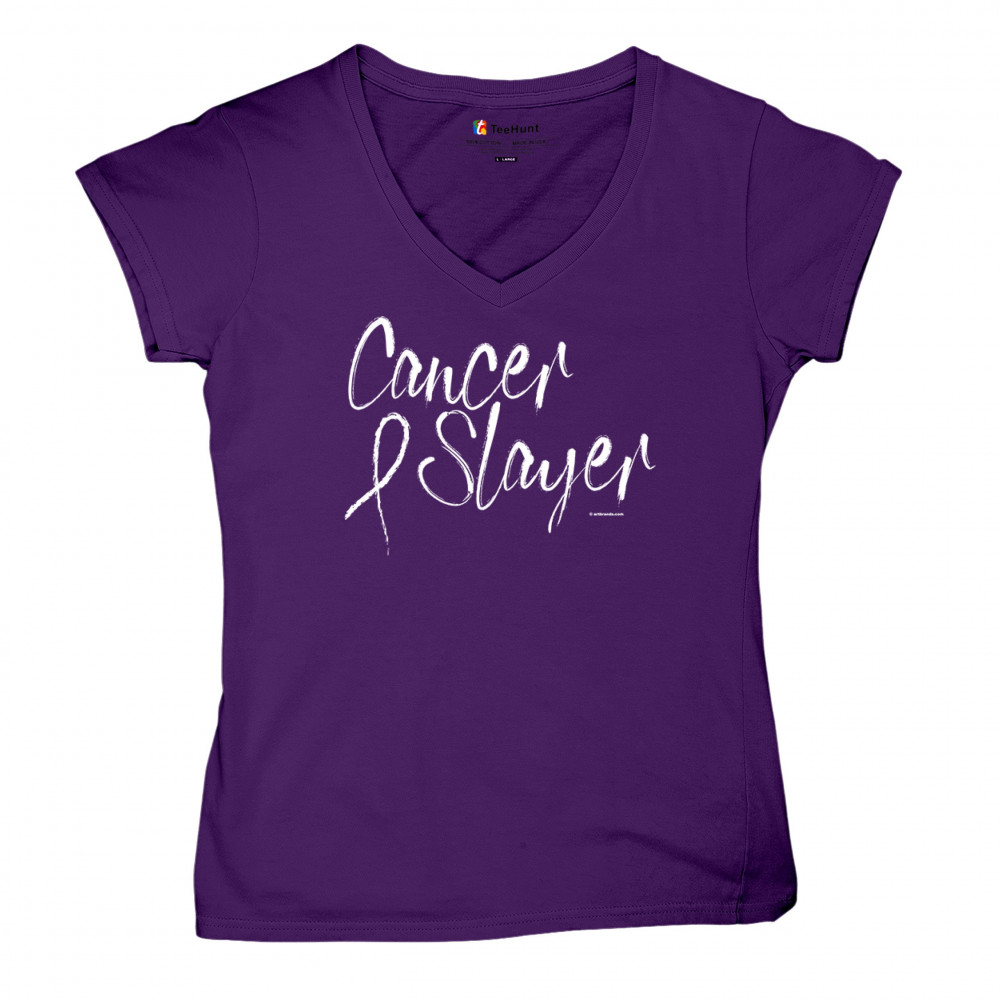CANCER SLAYER women's v-neck t-shirt breast cancer awareness ribbon hope tee purple