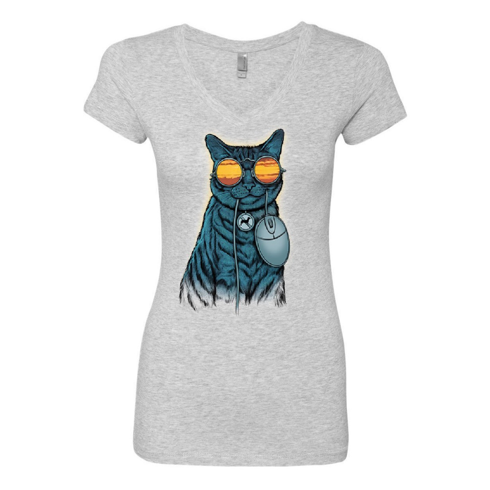 CAT AND MOUSE women's v-neck t-shirt funny cat kitten hacker antidog anonymouse gray