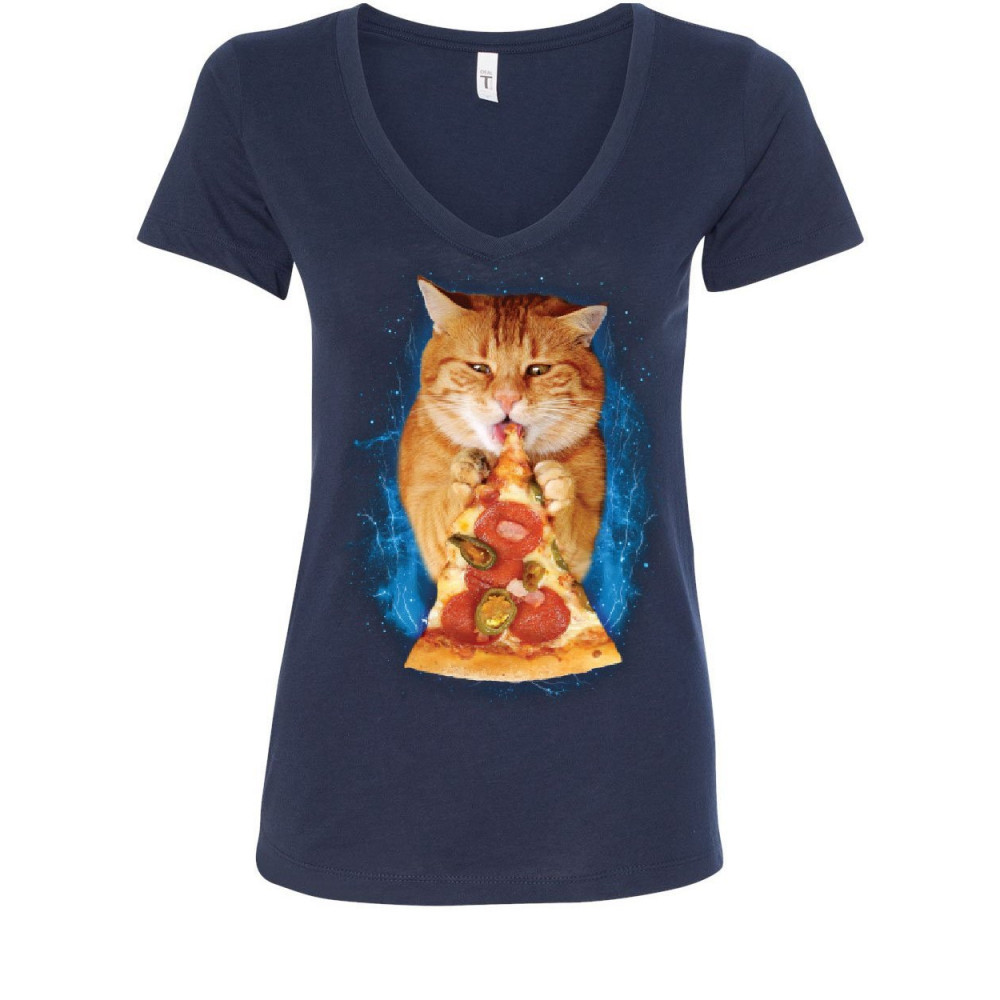 CAT EATING PIZZA women's v-neck t-shirt funny weird kitten pet kitty peperoni navy blue