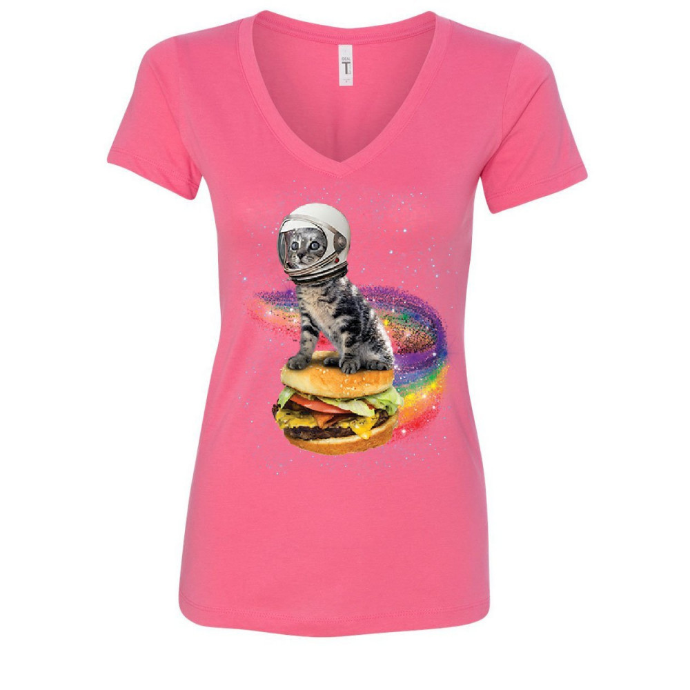 CAT FLYING A RAINBOW BURGER women's v-neck t-shirt funny astronaut kitten space pink