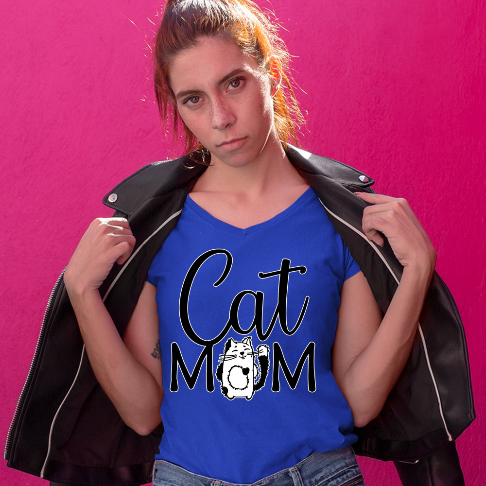 CAT MOM women's v-neck t-shirt mother's day fur mama cat lover kitty tee royal blue