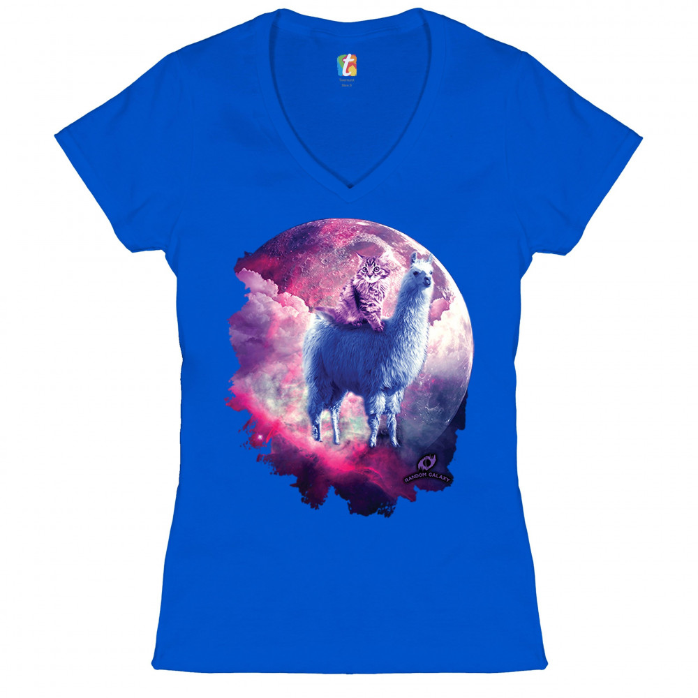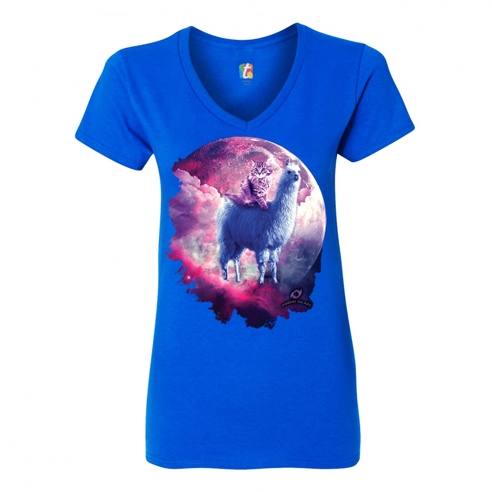 CAT RIDING A LLAMA IN SPACE women's v-neck t-shirt weird galaxy moon tee royal blue