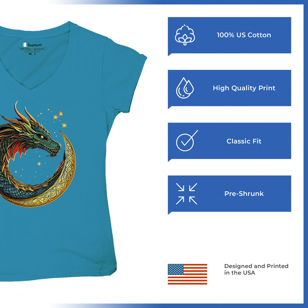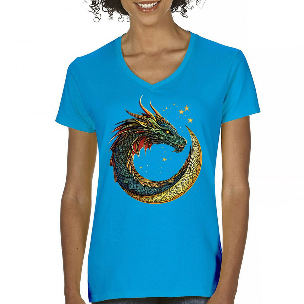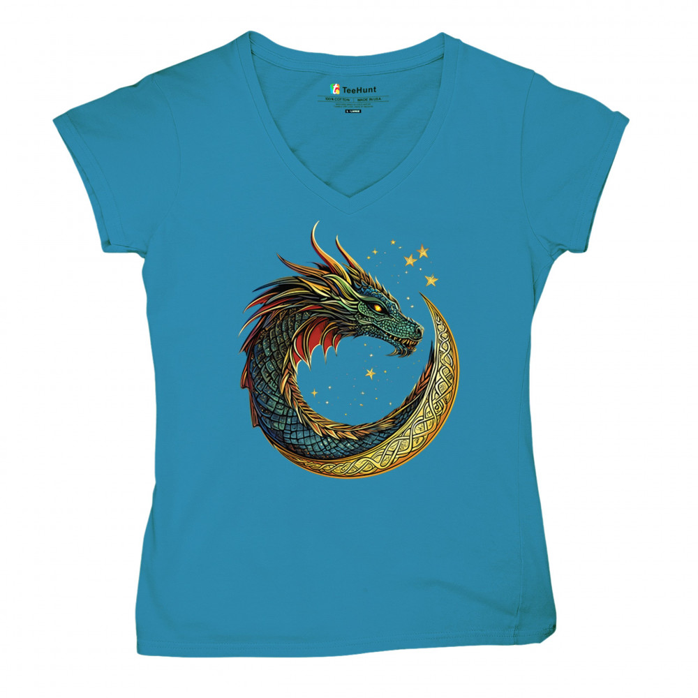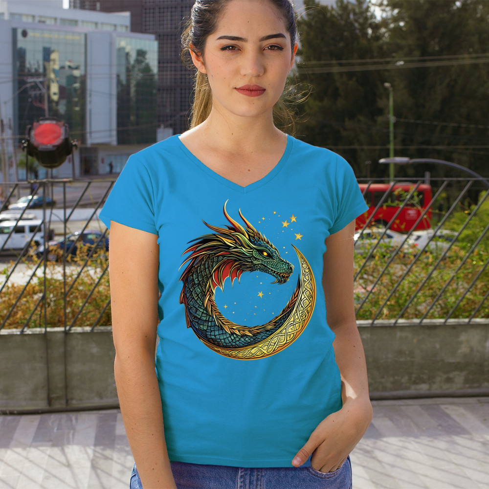 Fierce dragon in Celtic crescent moon with glowing eyes and starry sky. Perfect for fantasy fans, gamers, and spiritual warriors seeking mythic art.