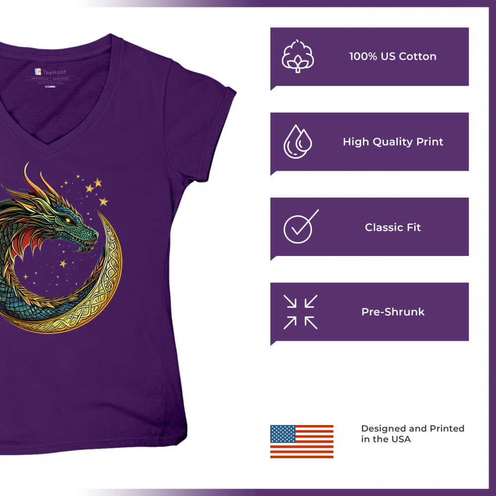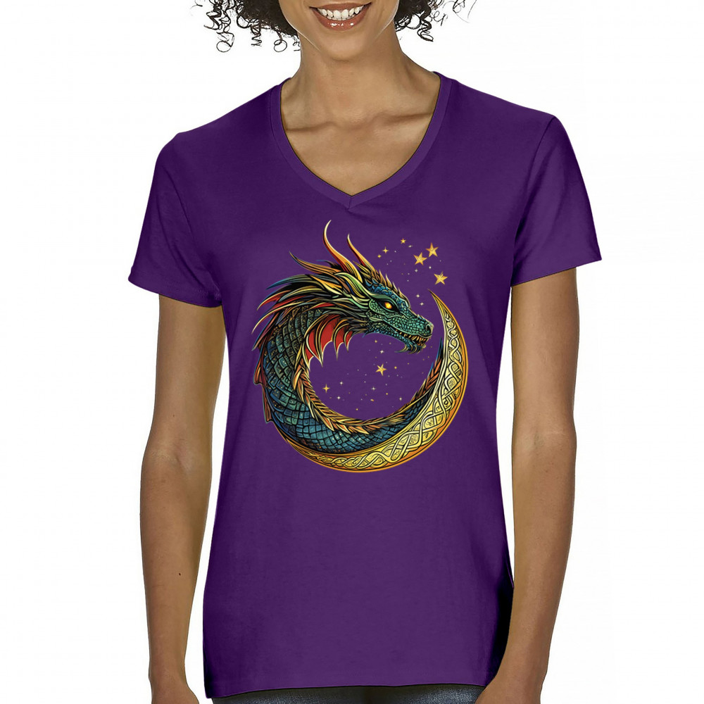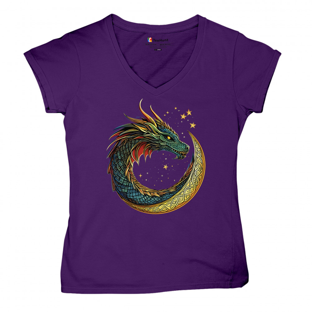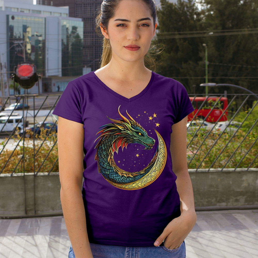 Fierce dragon in Celtic crescent moon with glowing eyes and starry sky. Perfect for fantasy fans, gamers, and spiritual warriors seeking mythic art.
