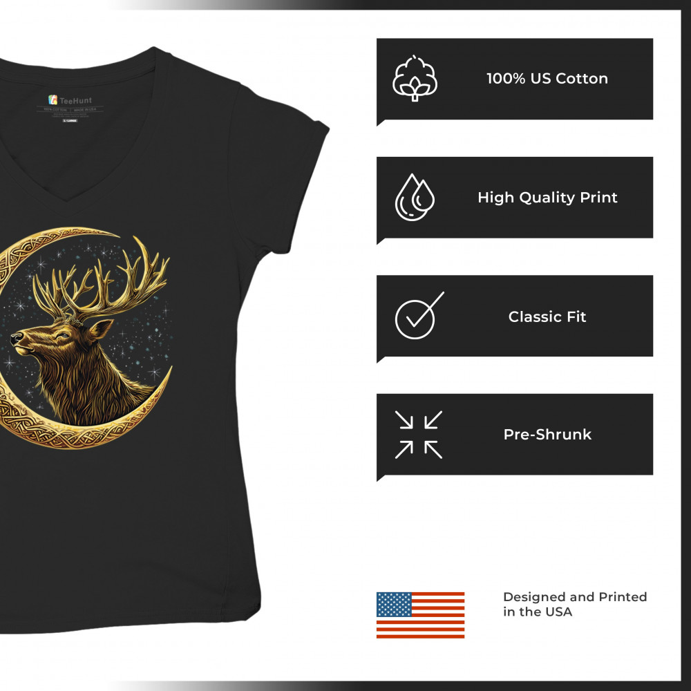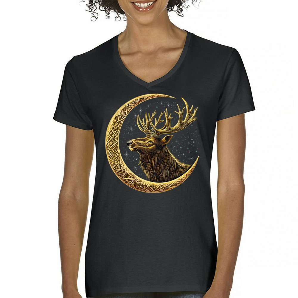 Celtic stag design with golden moon and cosmic stars. Symbolizes forest strength, leadership, and spiritual energy. Perfect for nature lovers.