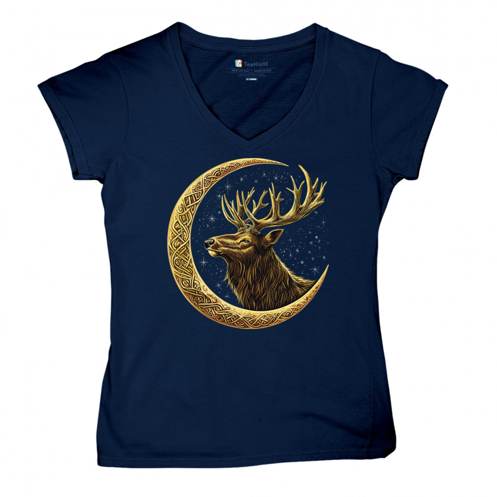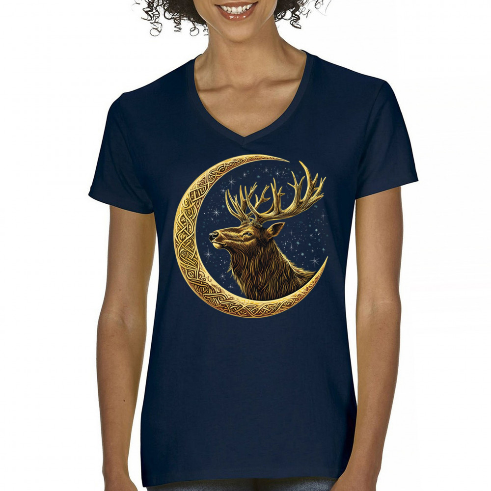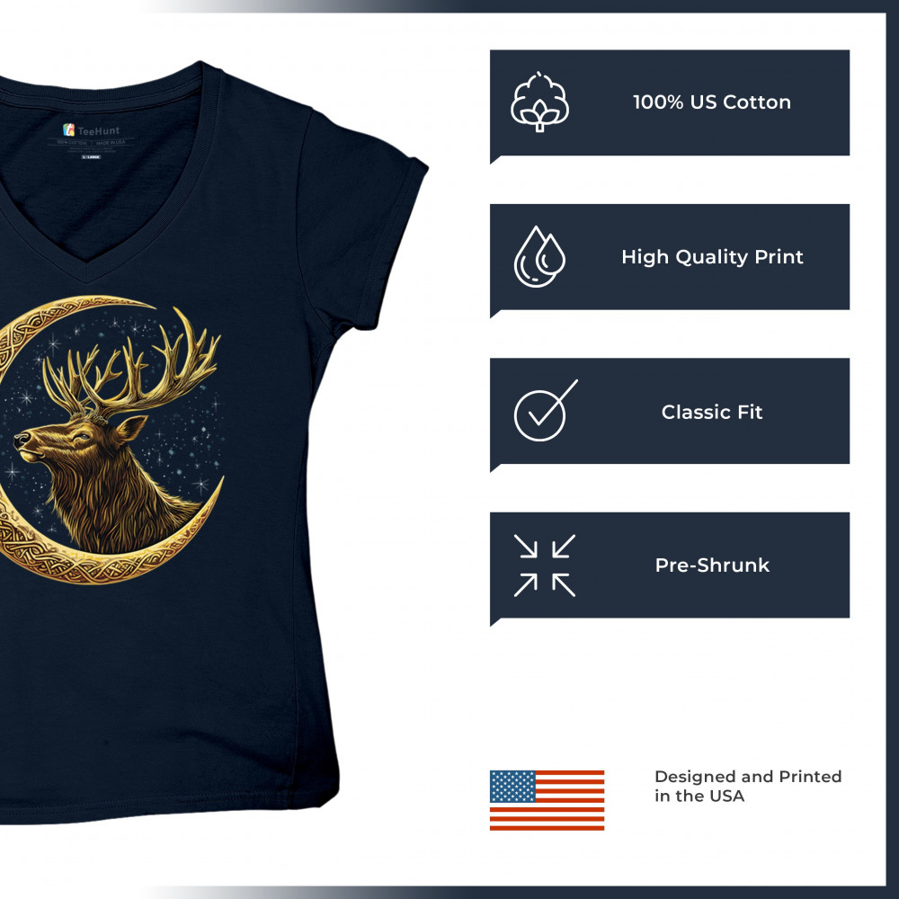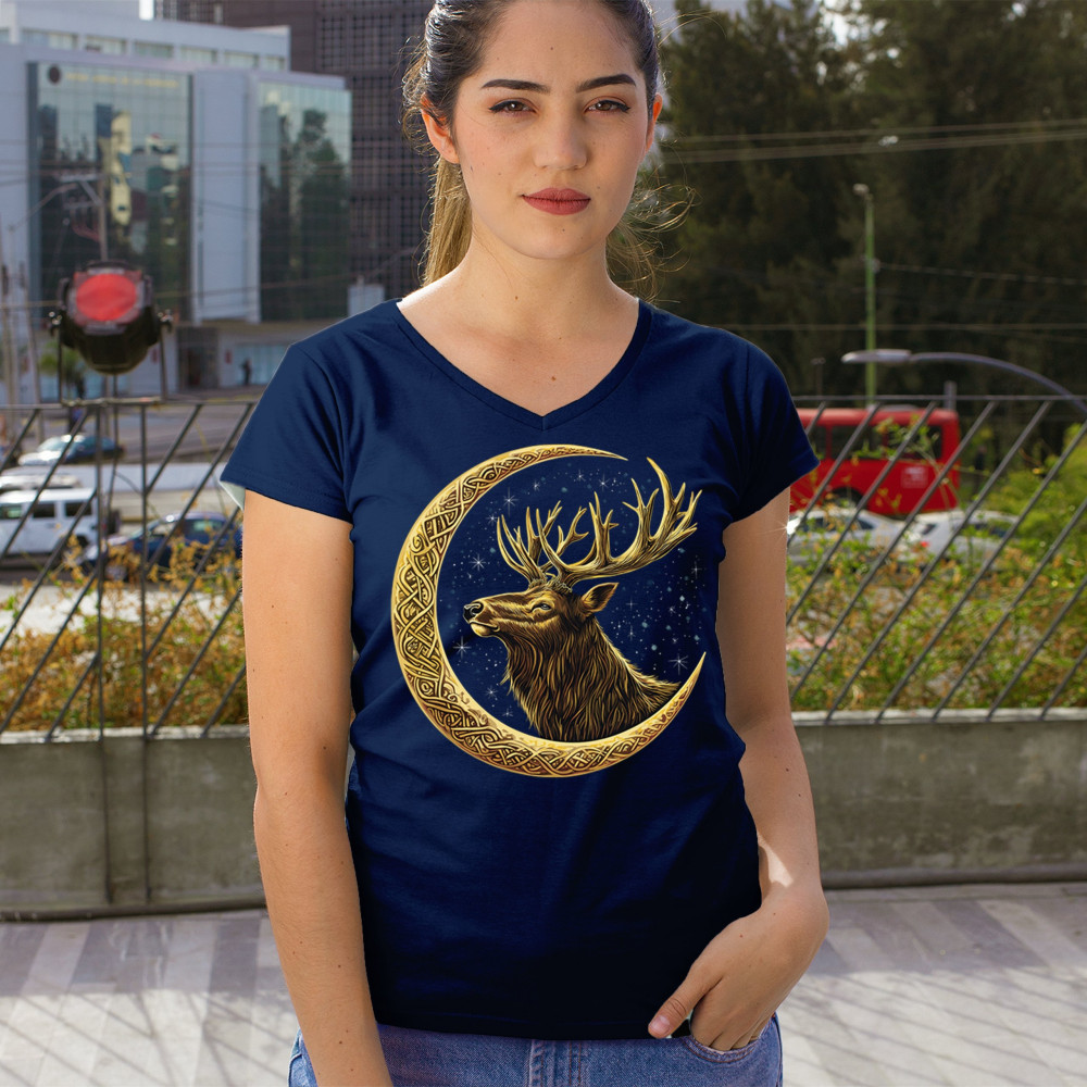 Celtic stag design with golden moon and cosmic stars. Symbolizes forest strength, leadership, and spiritual energy. Perfect for nature lovers.