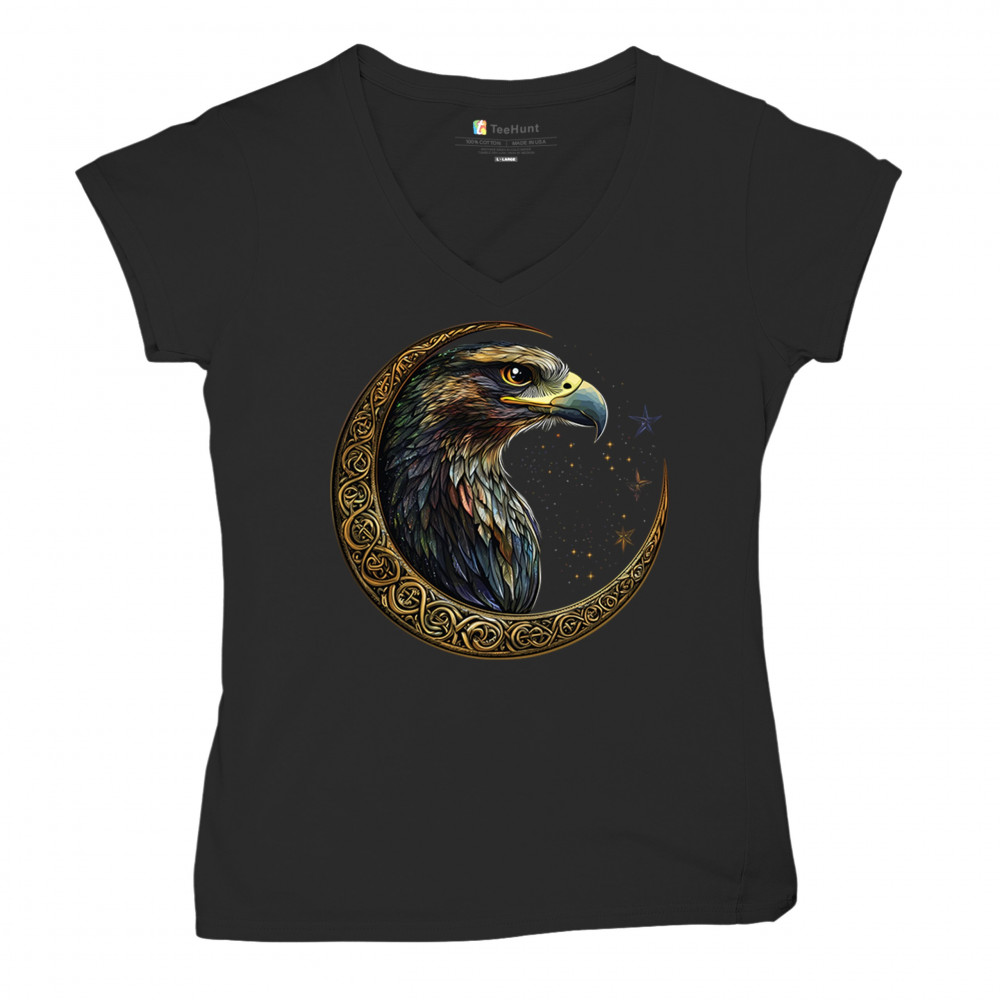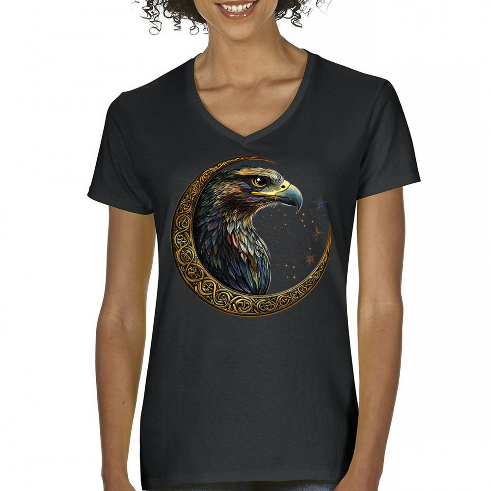 A beautifully detailed eagle with vibrant feathers is framed by a golden Celtic crescent moon and surrounded by a starry cosmic sky. This striking design represents freedom, spiritual power, and the mystery of the skies. Perfect for patriots, bird lovers, and those who connect with nature, tribal symbolism, and celestial art.