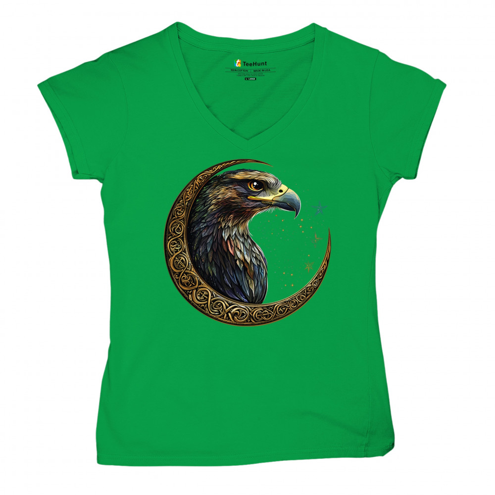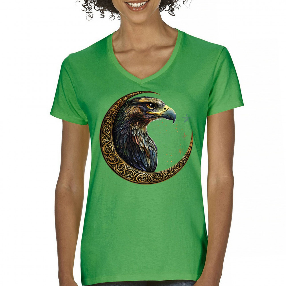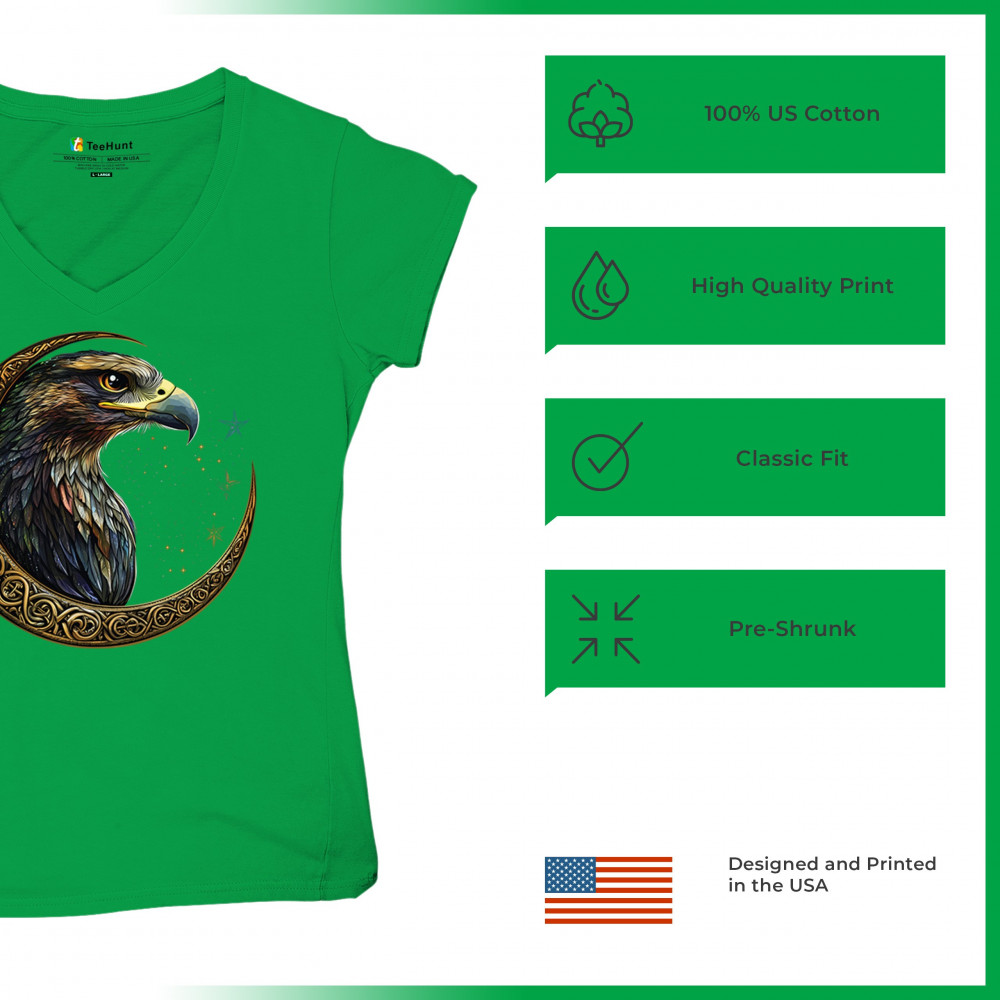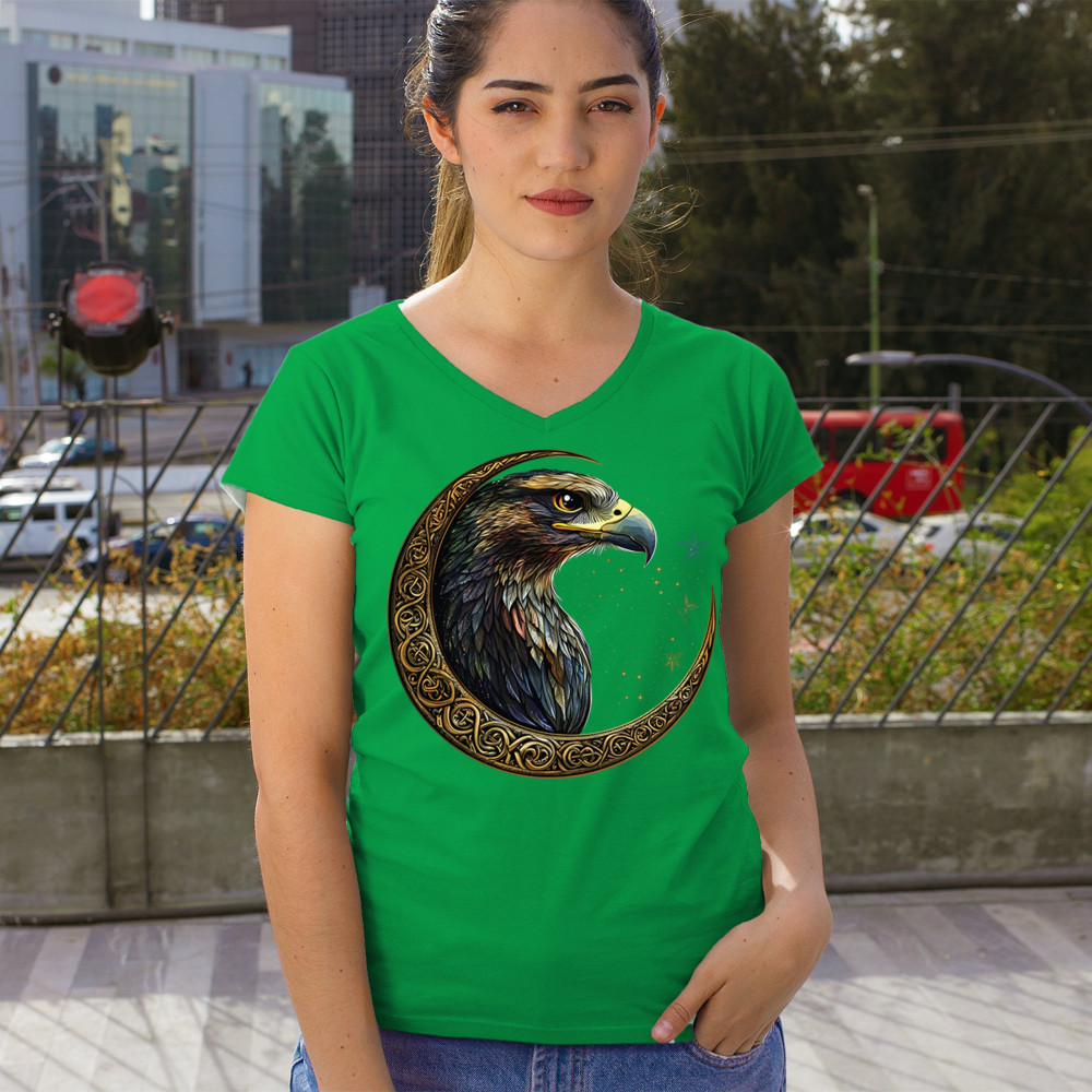 A beautifully detailed eagle with vibrant feathers is framed by a golden Celtic crescent moon and surrounded by a starry cosmic sky. This striking design represents freedom, spiritual power, and the mystery of the skies. Perfect for patriots, bird lovers, and those who connect with nature, tribal symbolism, and celestial art.