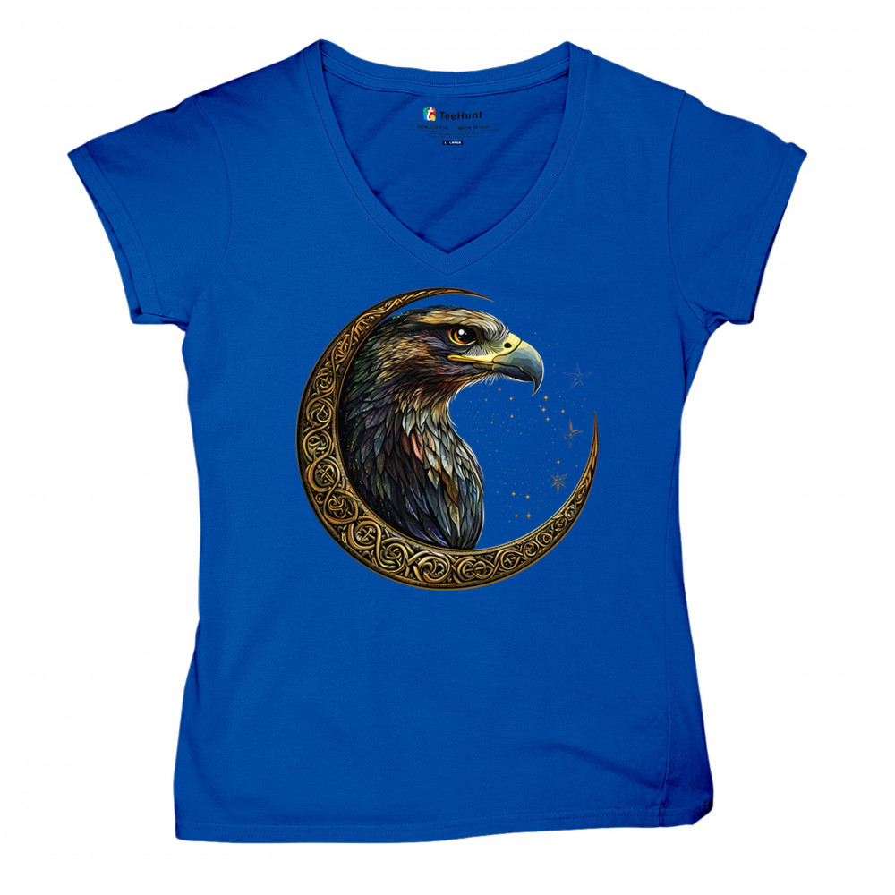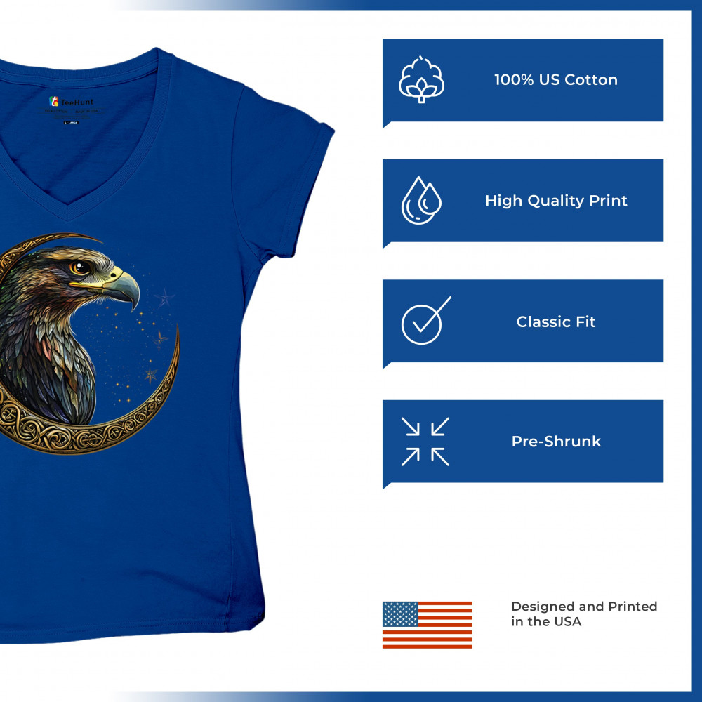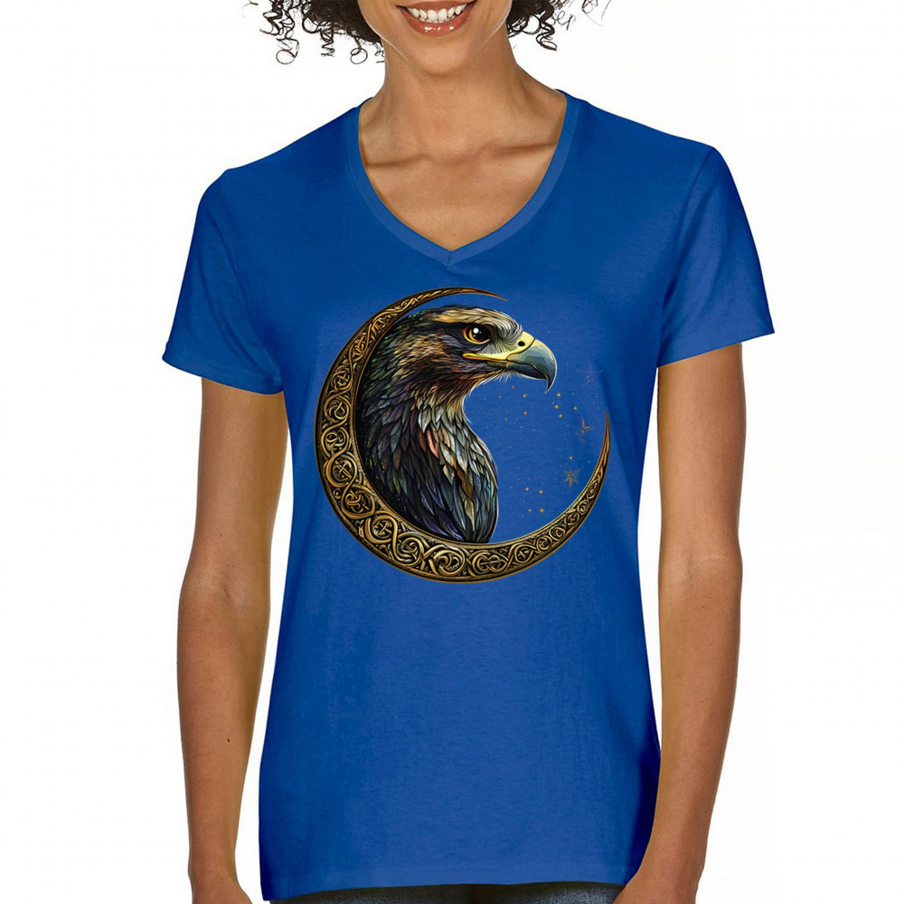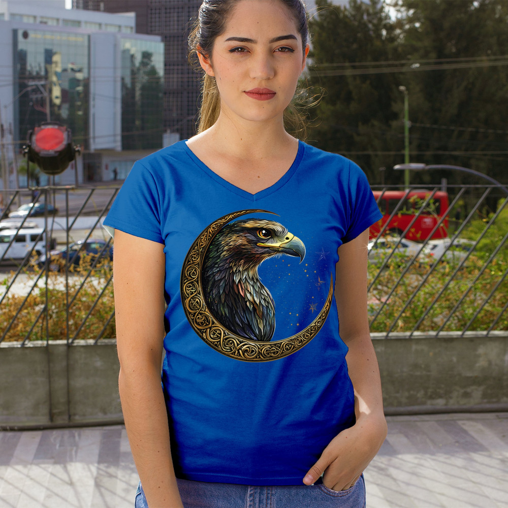 A beautifully detailed eagle with vibrant feathers is framed by a golden Celtic crescent moon and surrounded by a starry cosmic sky. This striking design represents freedom, spiritual power, and the mystery of the skies. Perfect for patriots, bird lovers, and those who connect with nature, tribal symbolism, and celestial art.