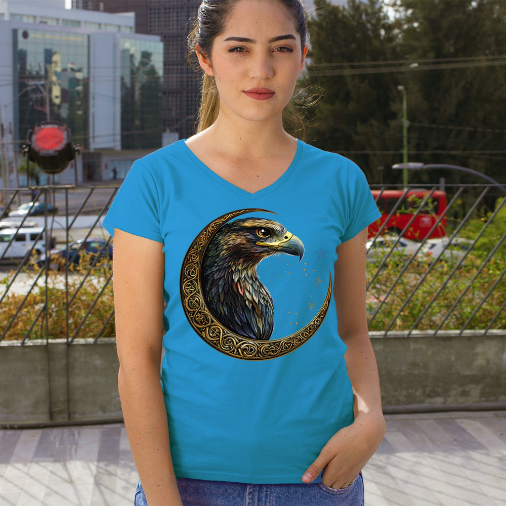 A beautifully detailed eagle with vibrant feathers is framed by a golden Celtic crescent moon and surrounded by a starry cosmic sky. This striking design represents freedom, spiritual power, and the mystery of the skies. Perfect for patriots, bird lovers, and those who connect with nature, tribal symbolism, and celestial art.