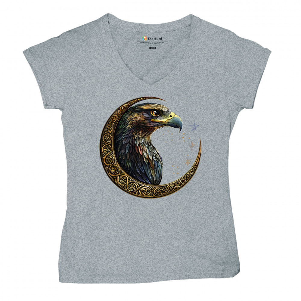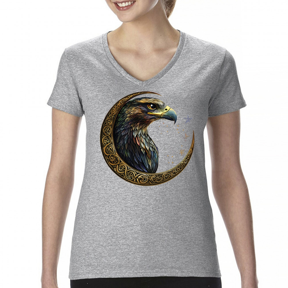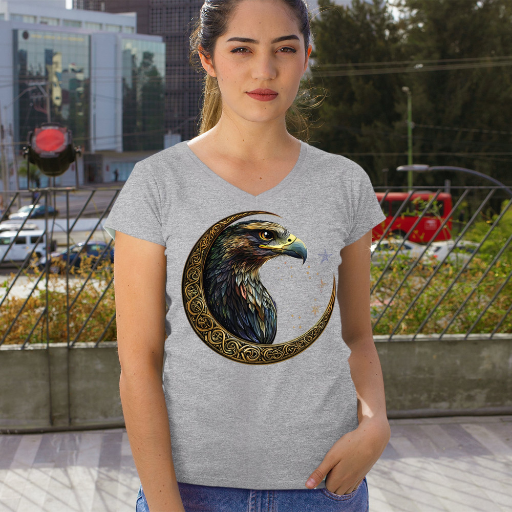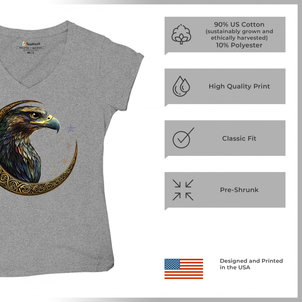 A beautifully detailed eagle with vibrant feathers is framed by a golden Celtic crescent moon and surrounded by a starry cosmic sky. This striking design represents freedom, spiritual power, and the mystery of the skies. Perfect for patriots, bird lovers, and those who connect with nature, tribal symbolism, and celestial art.