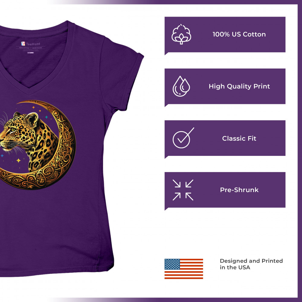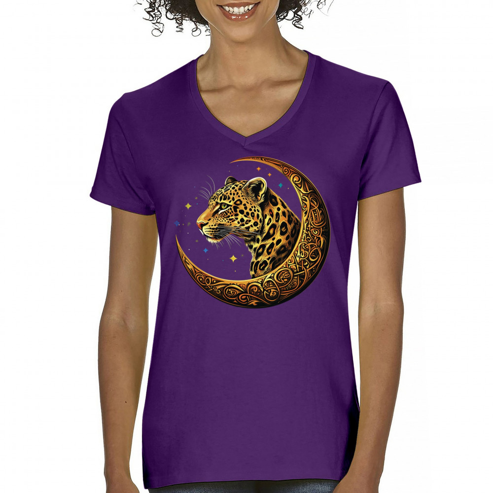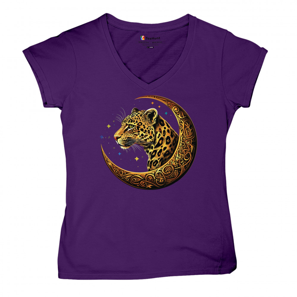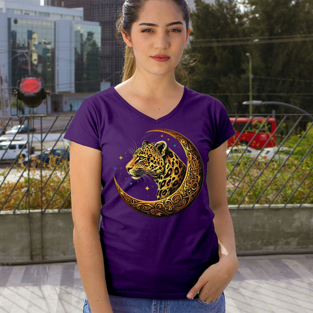 Leopard in Celtic moon with cosmic background. A fierce and spiritual design for big cat lovers, jungle fans, mystics, and fantasy art seekers.