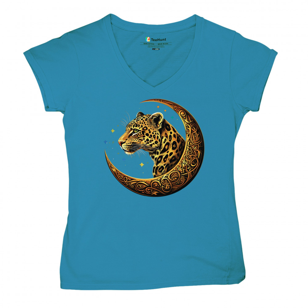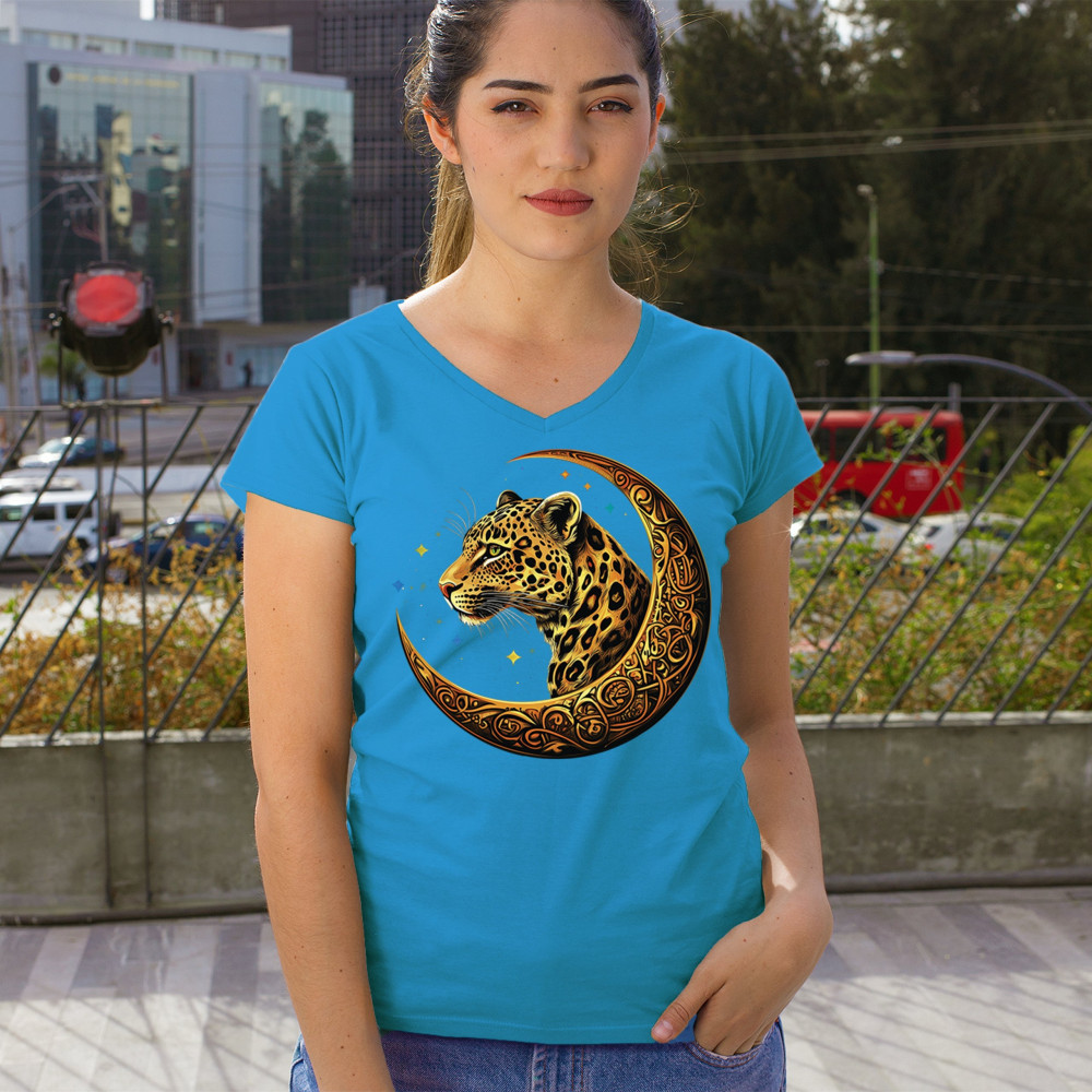 Leopard in Celtic moon with cosmic background. A fierce and spiritual design for big cat lovers, jungle fans, mystics, and fantasy art seekers.