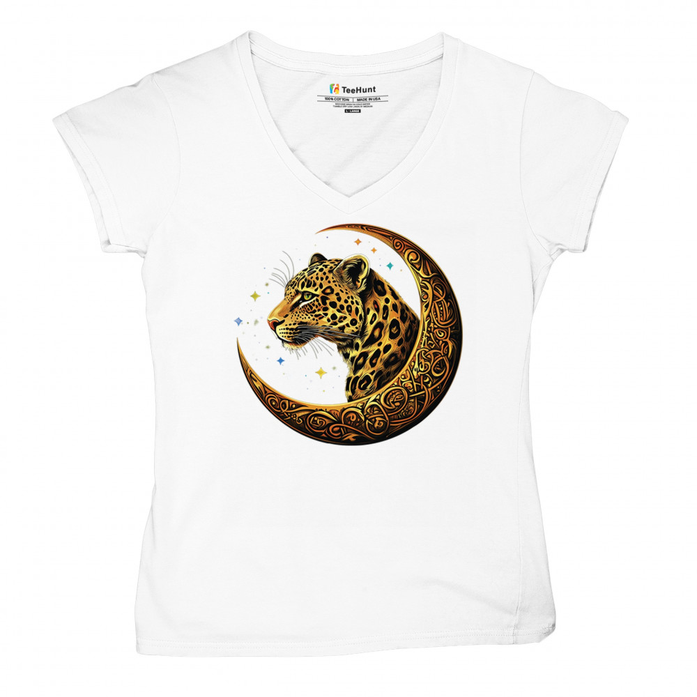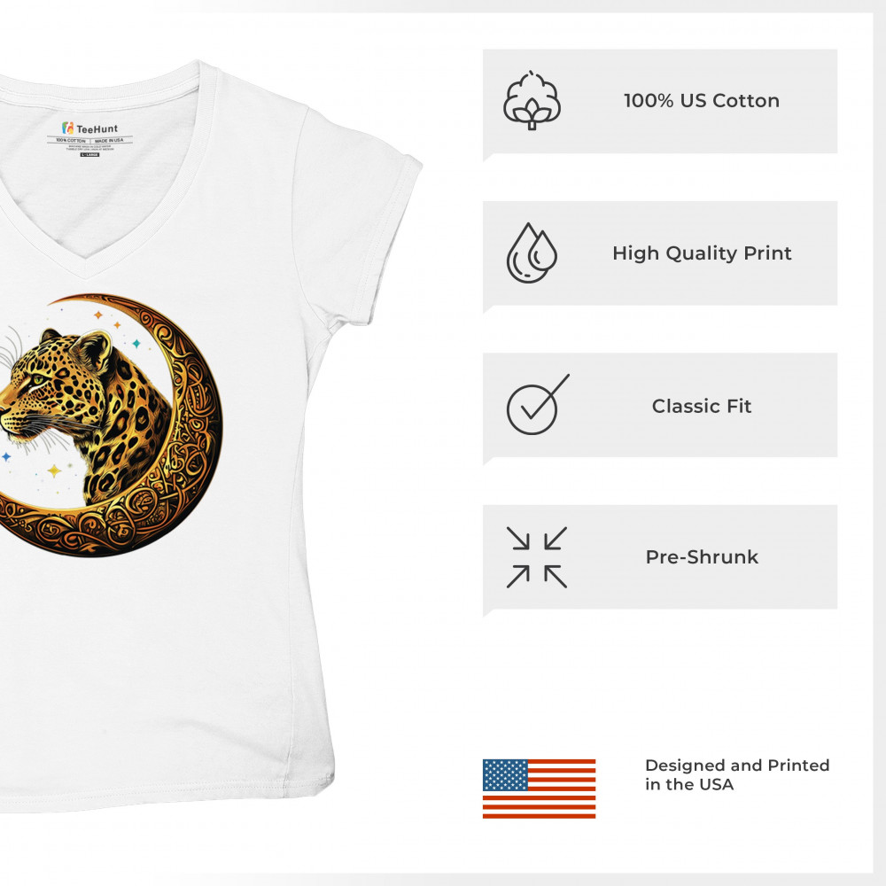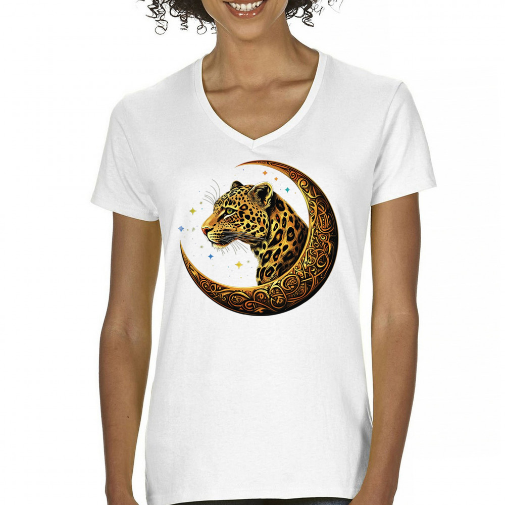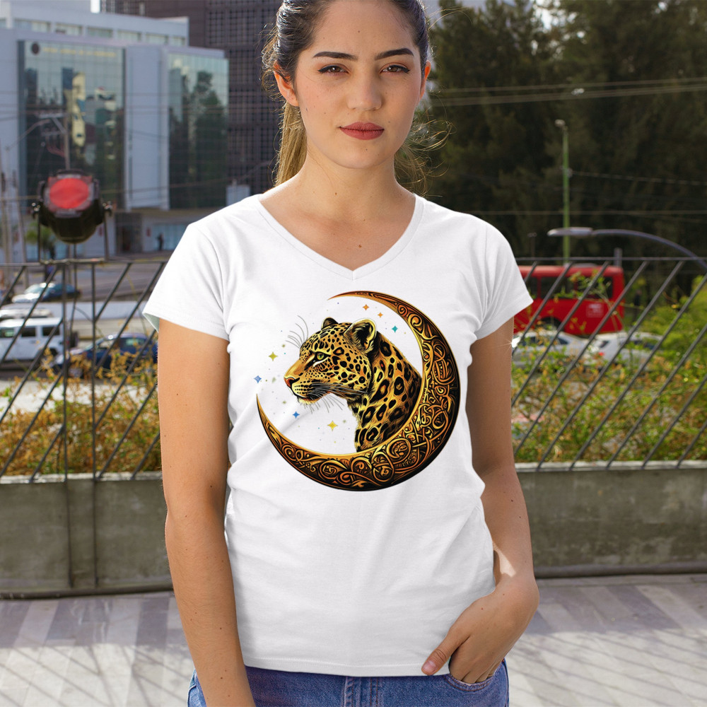 Leopard in Celtic moon with cosmic background. A fierce and spiritual design for big cat lovers, jungle fans, mystics, and fantasy art seekers.