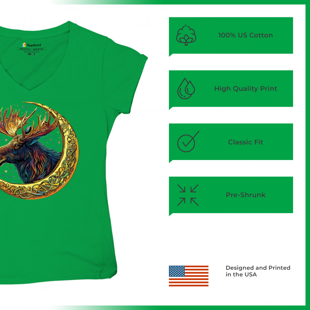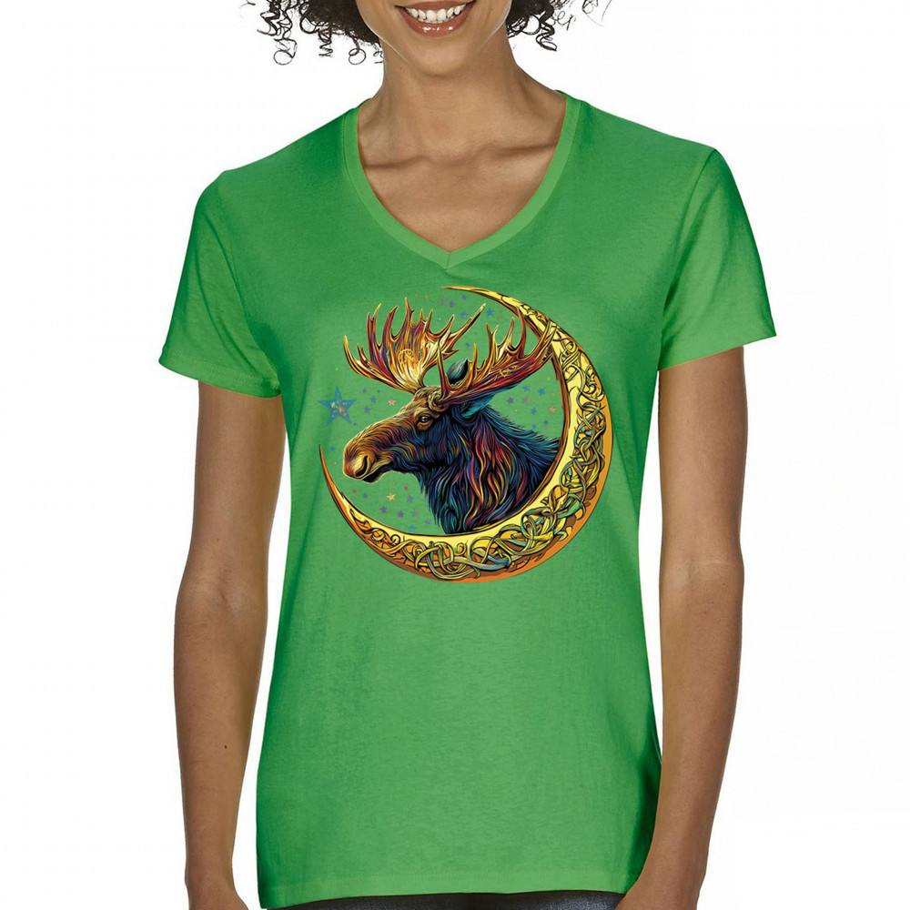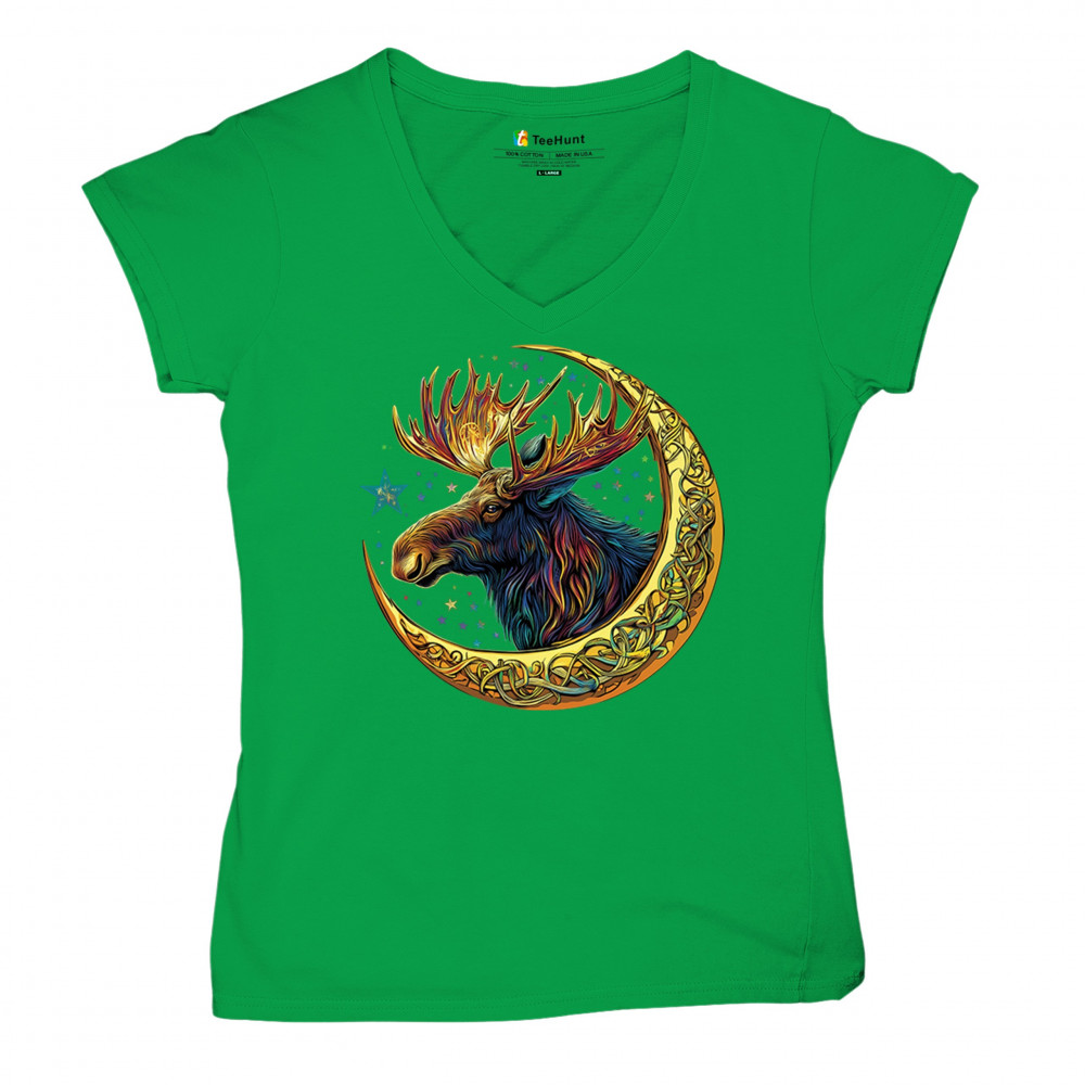 Mystical moose in gold Celtic crescent moon design—symbolizes strength, nature wisdom, and cosmic spirit for fantasy lovers and woodland fans.