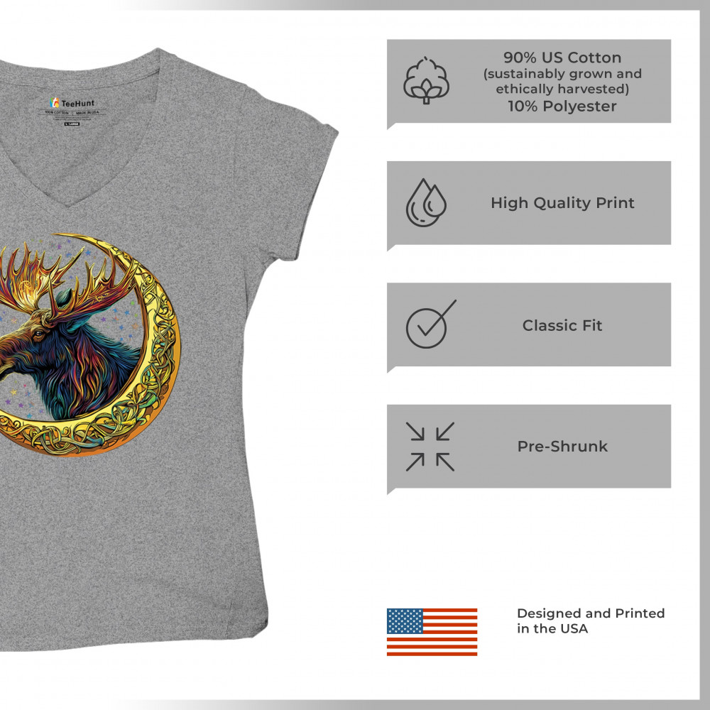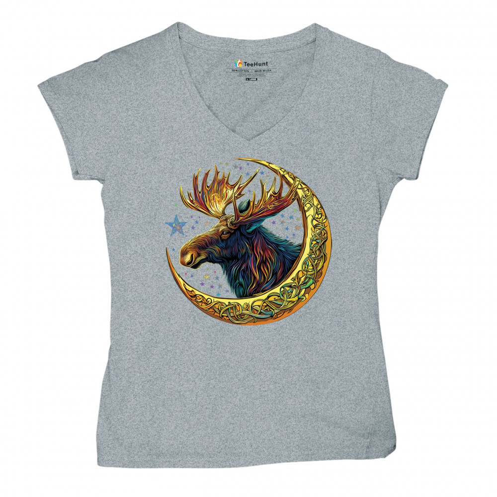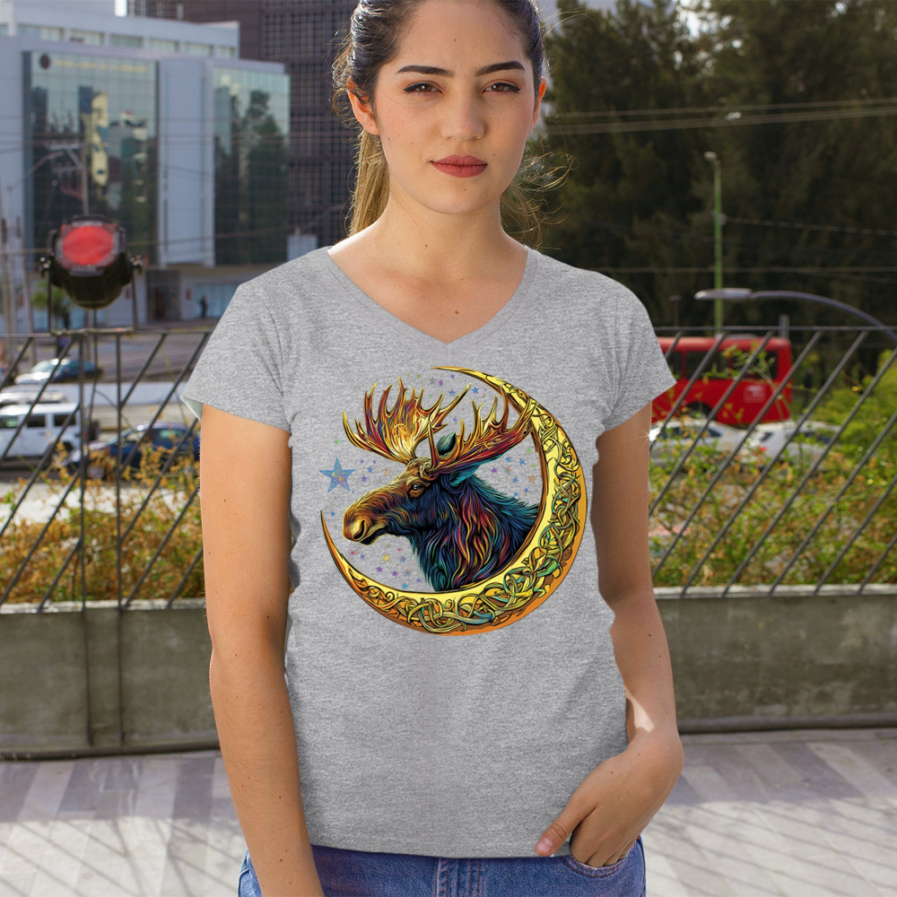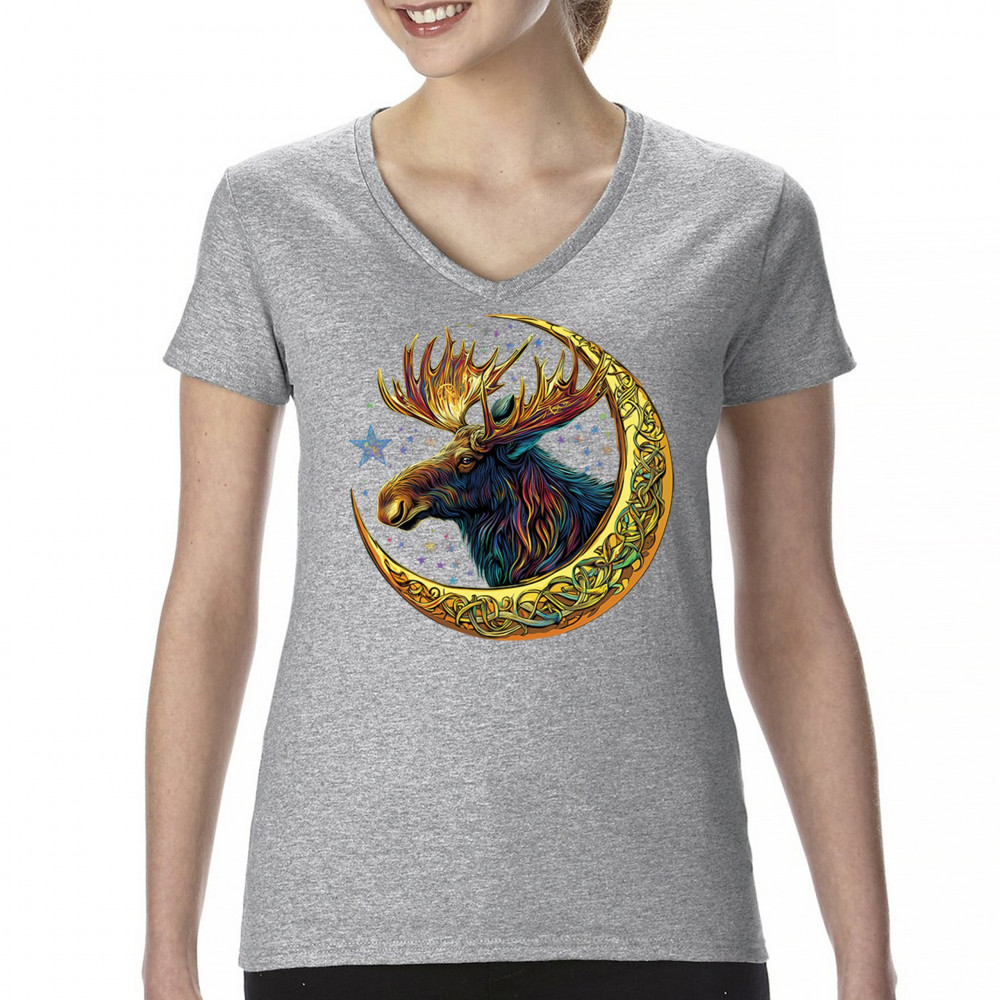 Mystical moose in gold Celtic crescent moon design—symbolizes strength, nature wisdom, and cosmic spirit for fantasy lovers and woodland fans.