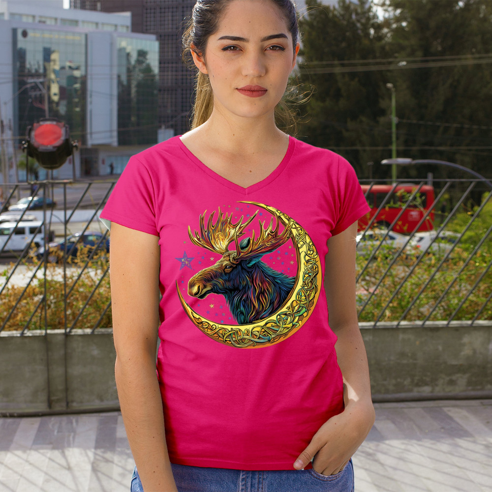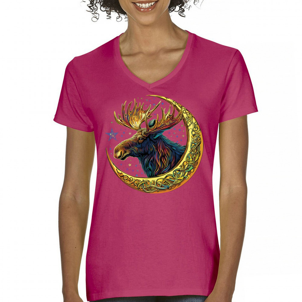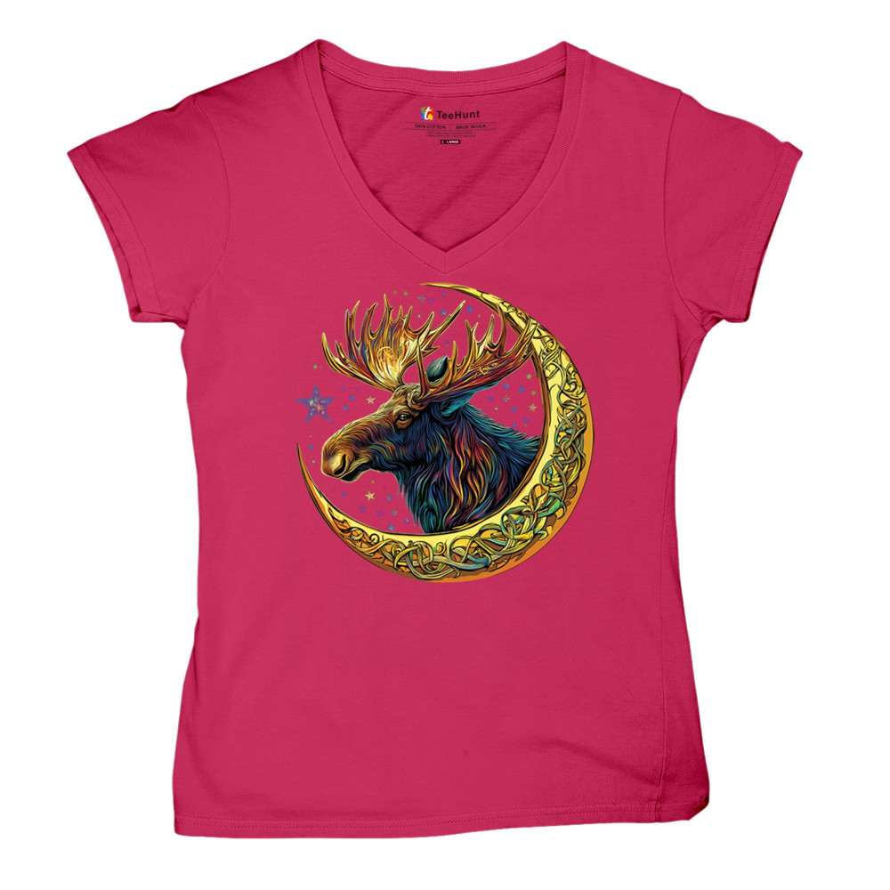 Mystical moose in gold Celtic crescent moon design—symbolizes strength, nature wisdom, and cosmic spirit for fantasy lovers and woodland fans.