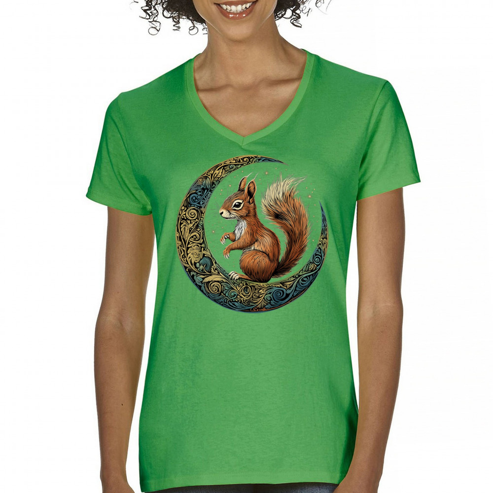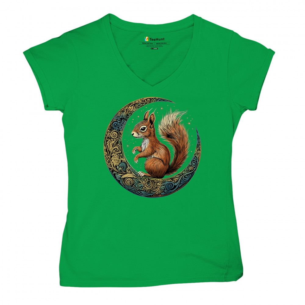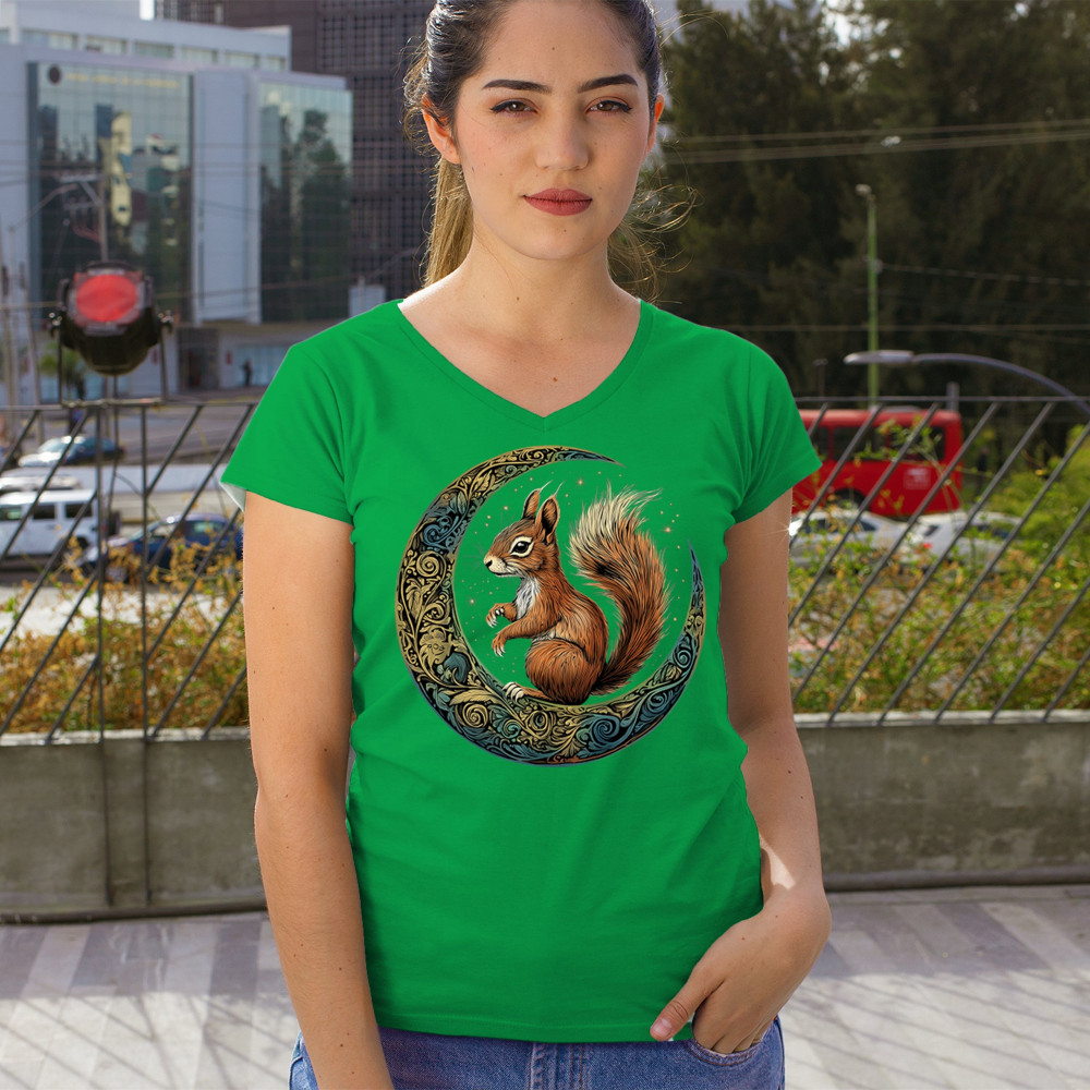 Red squirrel in green-gold Celtic crescent moon with cosmic sky. Symbolizes agility, planning, and mystical forest energy in a fantasy design.