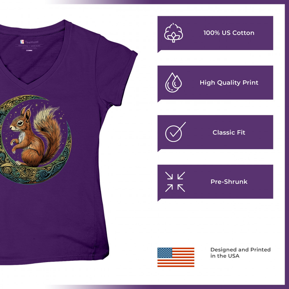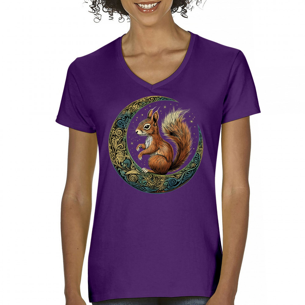 Red squirrel in green-gold Celtic crescent moon with cosmic sky. Symbolizes agility, planning, and mystical forest energy in a fantasy design.