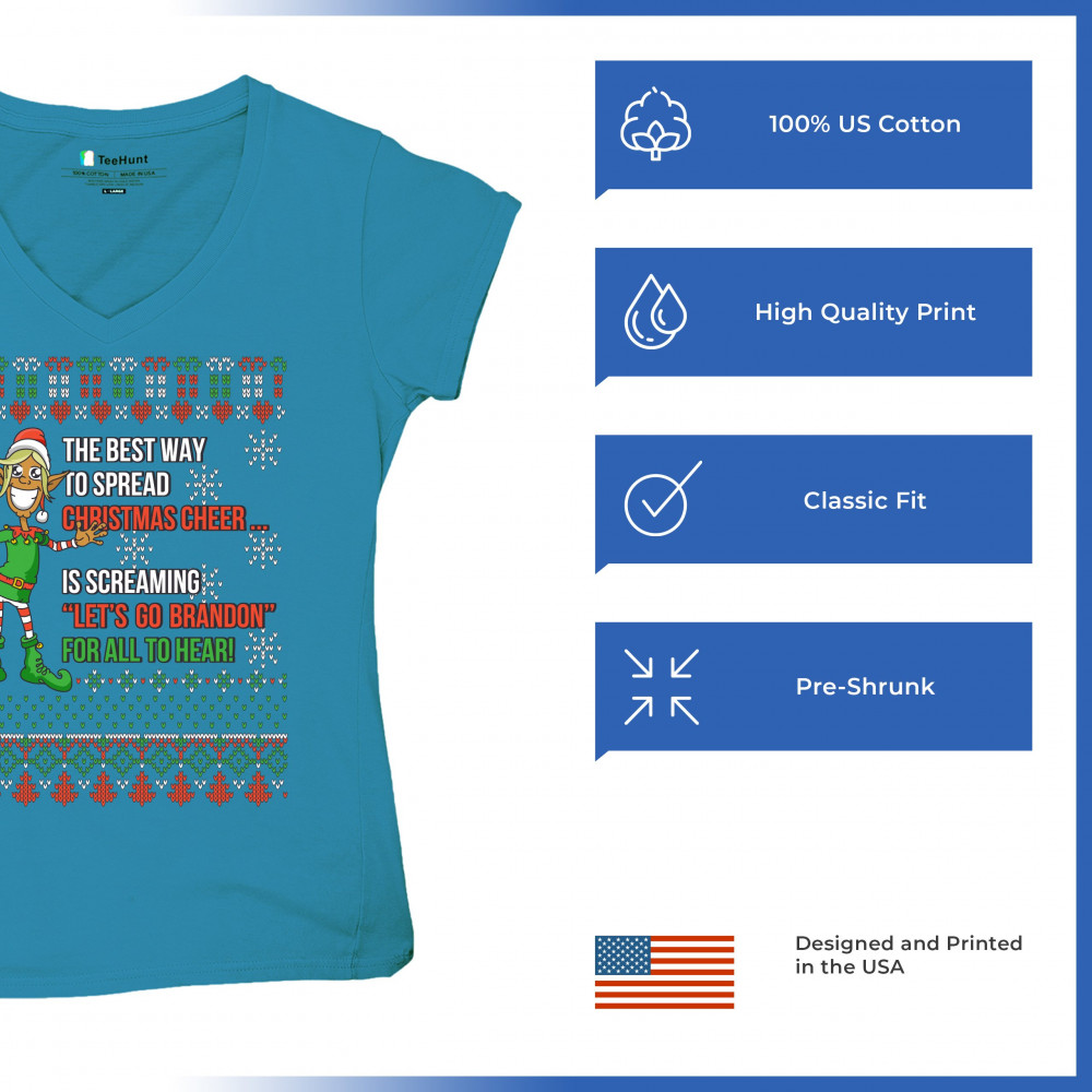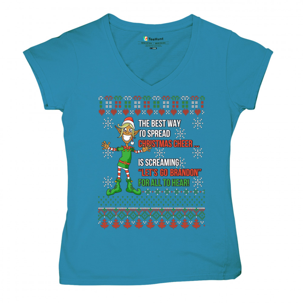 CHRISTMAS CHEER LET'S GO BRANDON women's v-neck t-shirt ugly sweater xmas tee turquoise