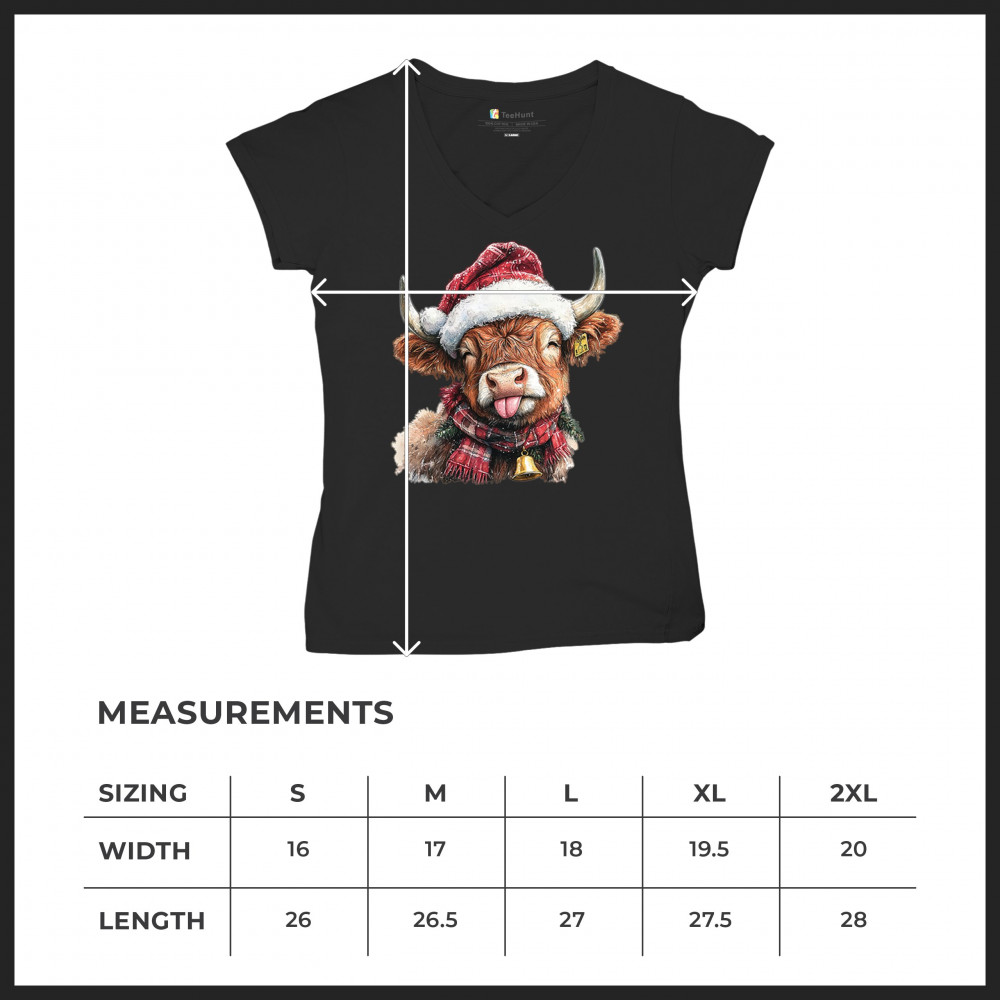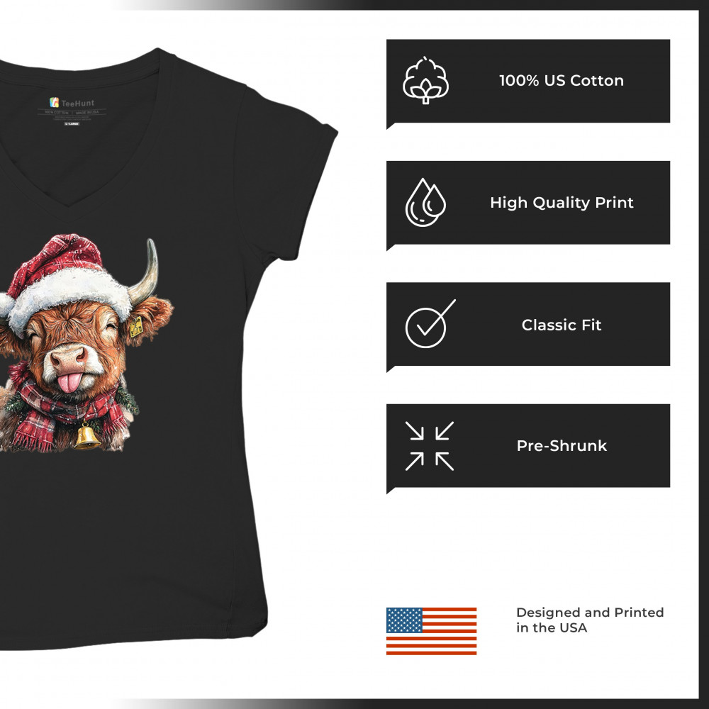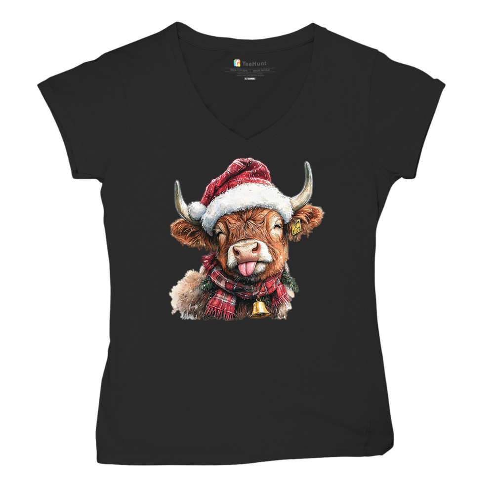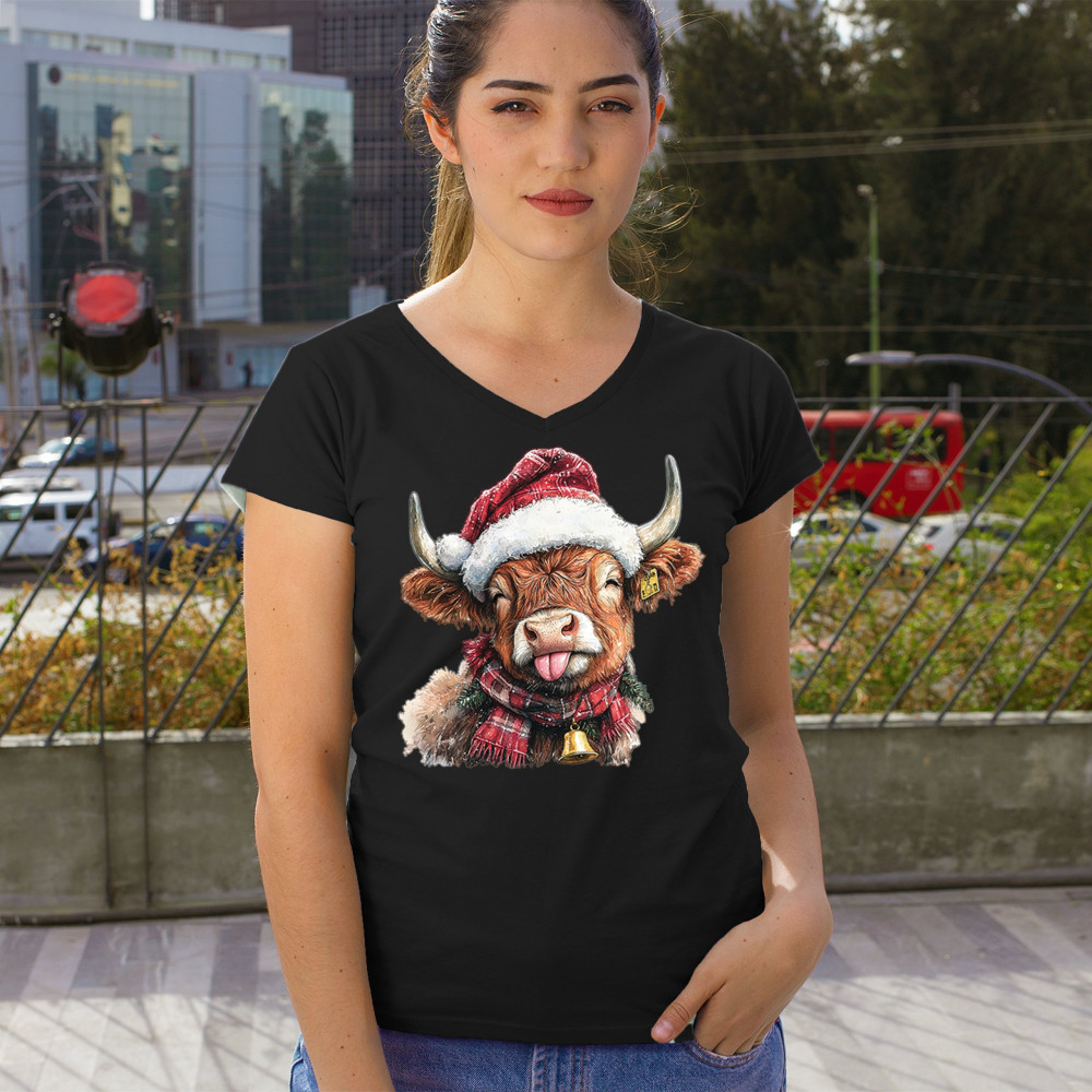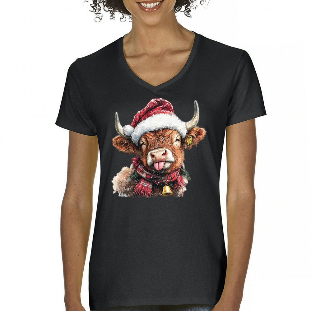 CHRISTMAS HIGHLAND COW women's v-neck t-shirt merry xmas tree cute farm bells black