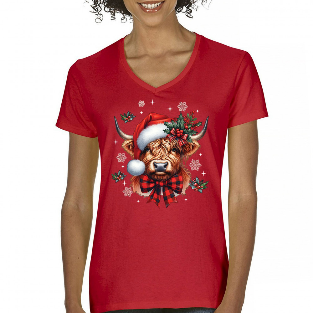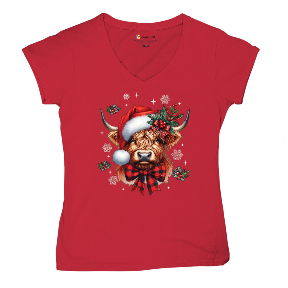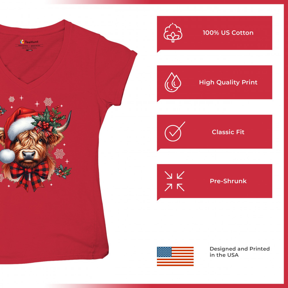 Festive Highland cow Christmas design with Santa hat, plaid bow, holly, and rustic farmhouse holiday charm. Perfect for cozy winter decor.