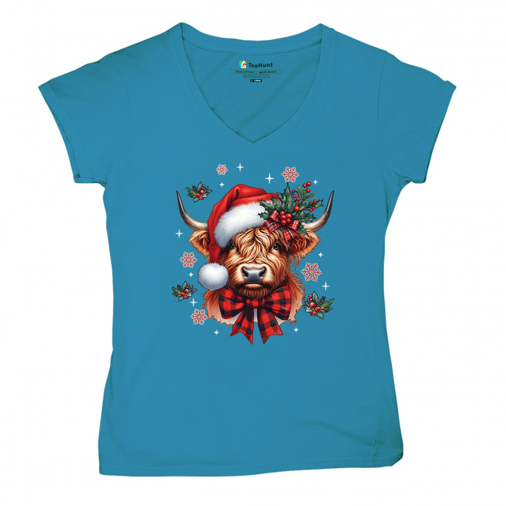 Festive Highland cow Christmas design with Santa hat, plaid bow, holly, and rustic farmhouse holiday charm. Perfect for cozy winter decor.
