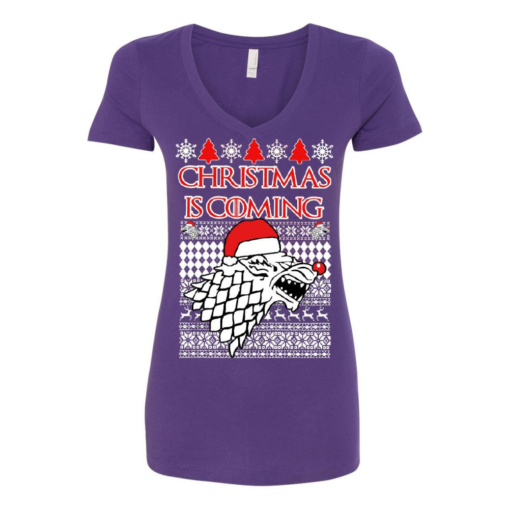 CHRISTMAS IS COMING DIREWOLF women's v-neck tee got parody ugly sweatshirt purple