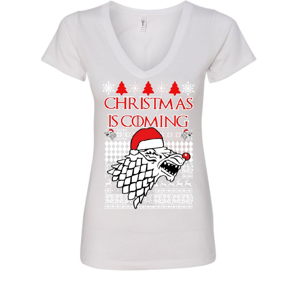 CHRISTMAS IS COMING DIREWOLF women's v-neck tee got parody ugly sweatshirt white