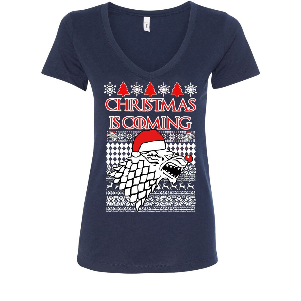 CHRISTMAS IS COMING DIREWOLF women's v-neck tee got parody ugly sweatshirt navy blue