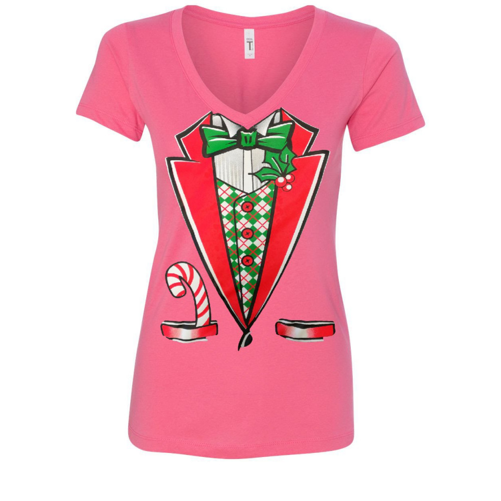 CHRISTMAS TUXEDO v-neck t-shirt funny xmas santa elf pink