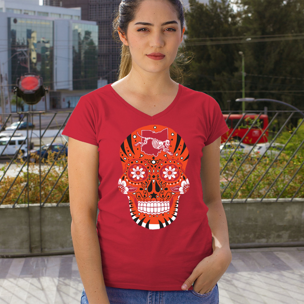 Cinci Sugar Skull with Queen City Paw, underdog grit, black & orange pride, Game Day energy, and playoff vibes.