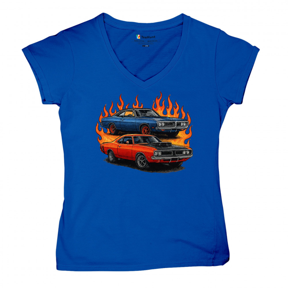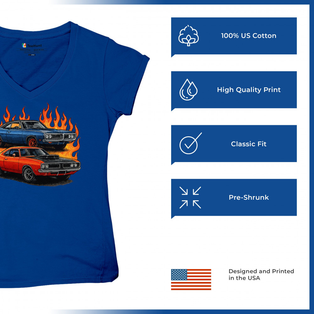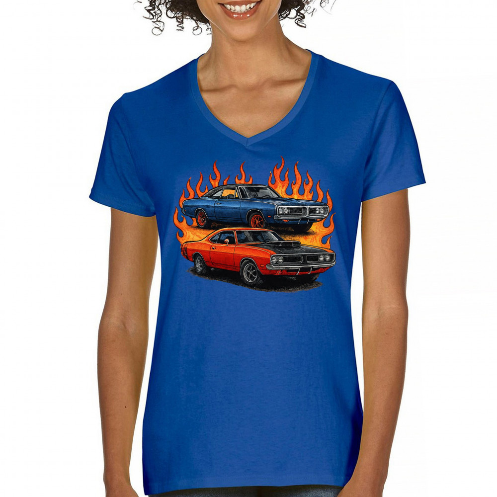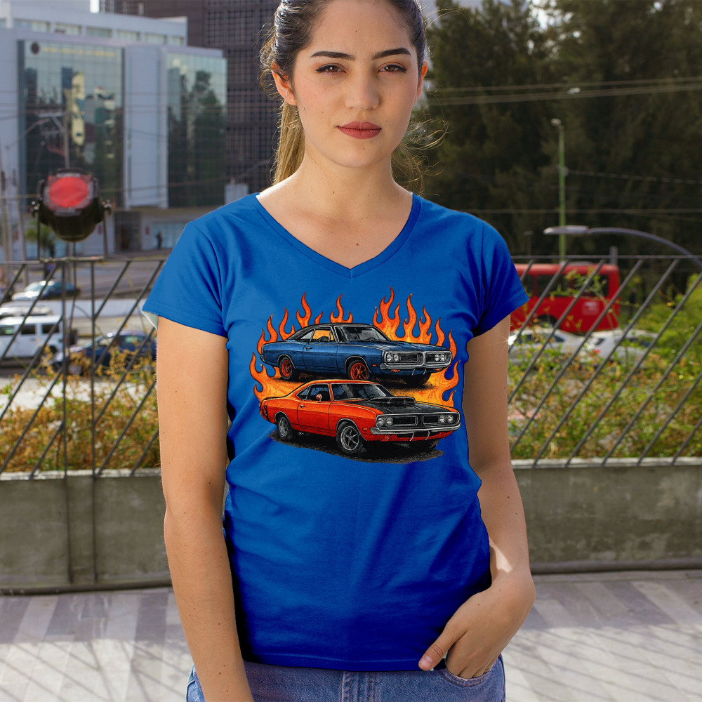 Bold flame design with classic muscle cars for gearheads and vintage horsepower lovers. Perfect for shows, cruise meets, and burnout nights.