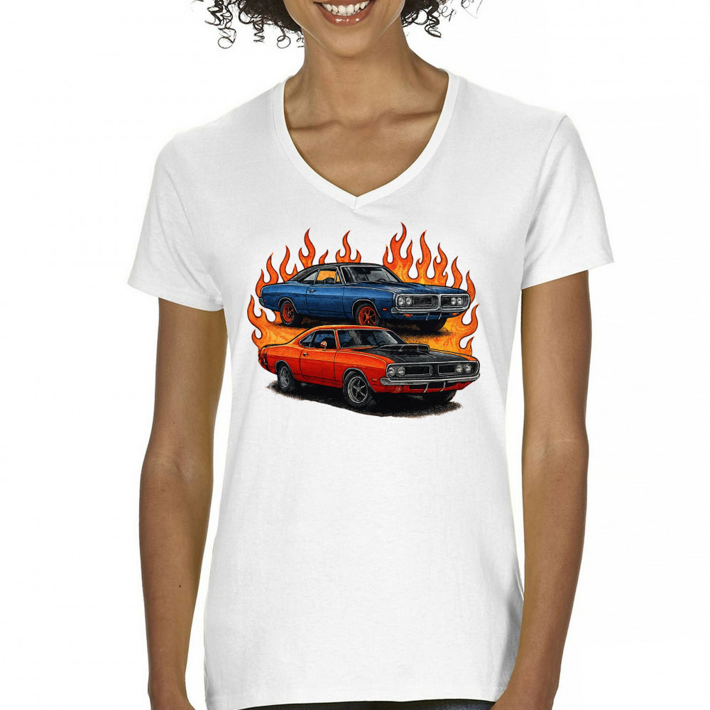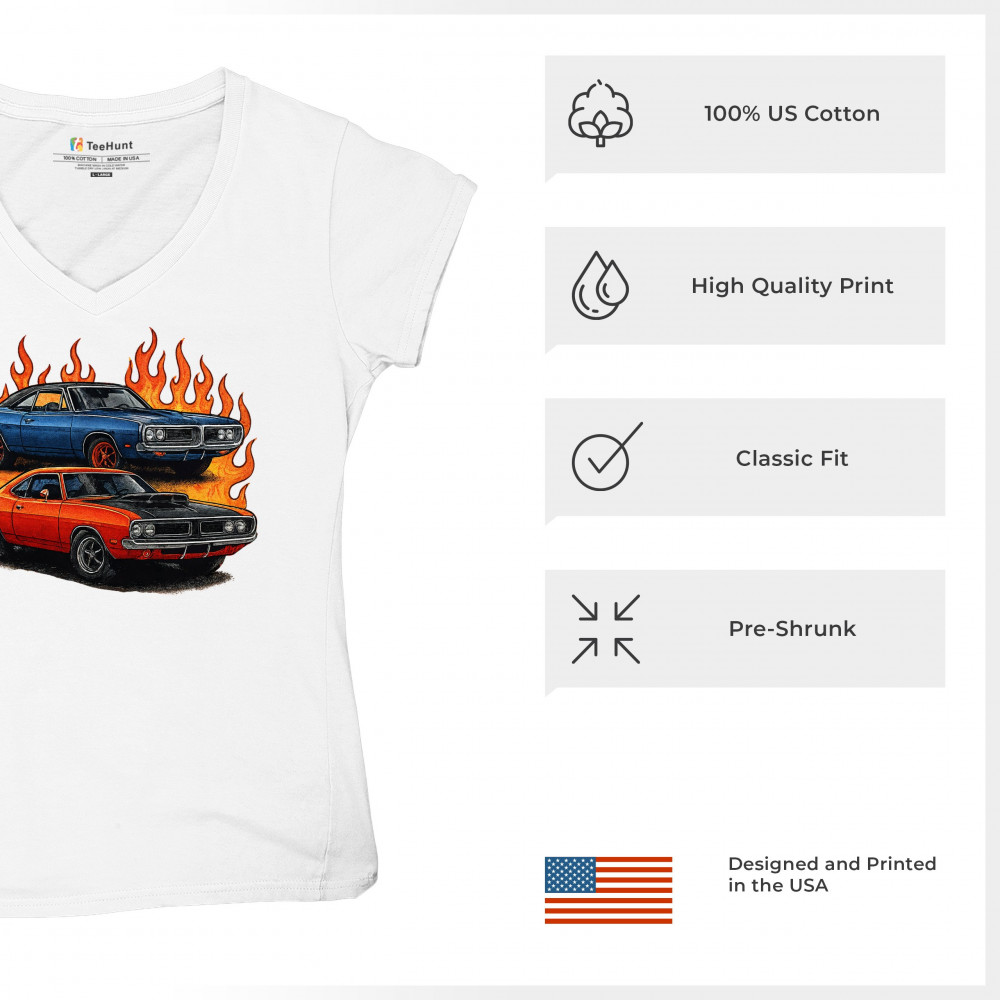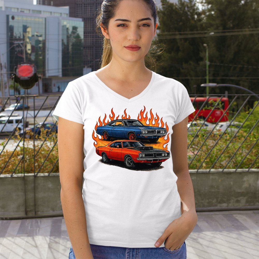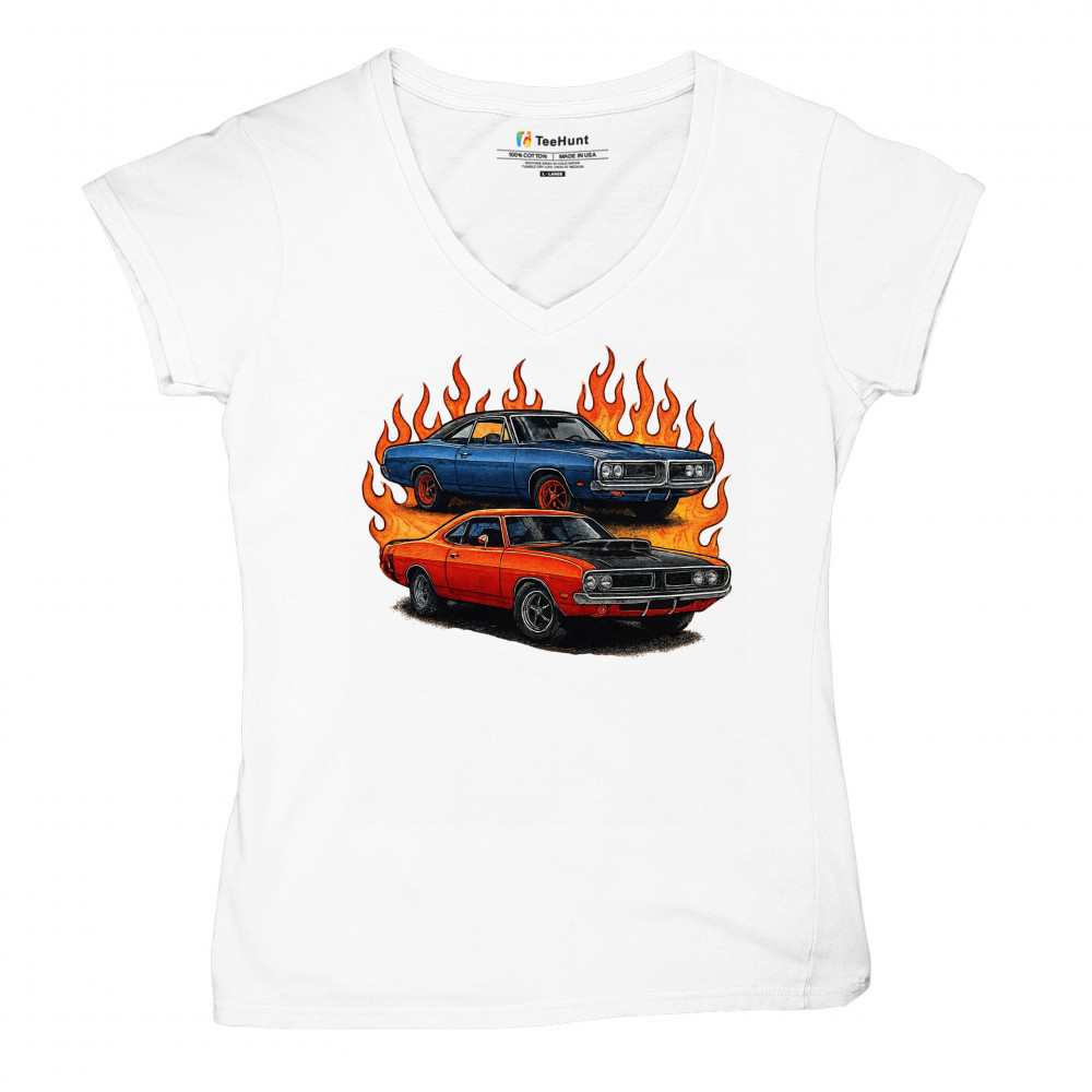 Bold flame design with classic muscle cars for gearheads and vintage horsepower lovers. Perfect for shows, cruise meets, and burnout nights.