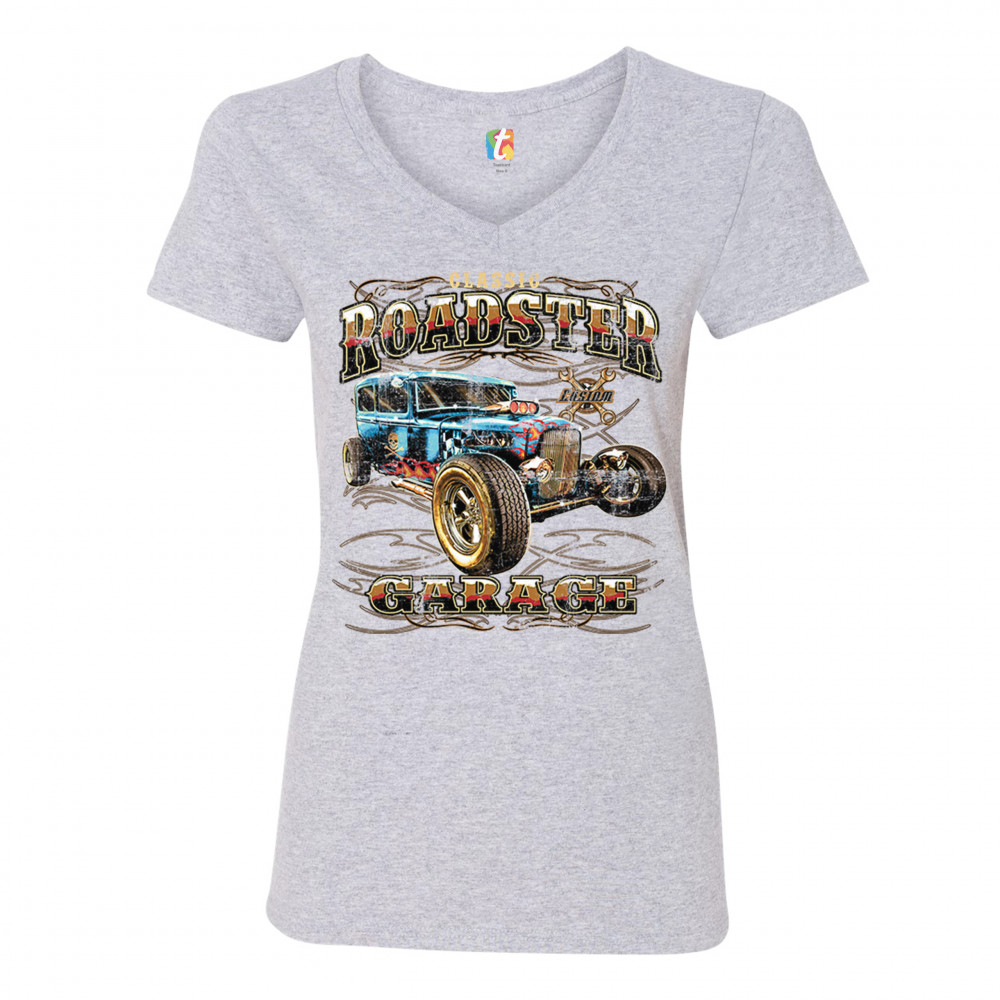 A print featuring a vintage-looking rat rod with flames and a skull with crossbones painted on it's side. "Classic Roadster" is written in the top and "Garage" in the bottom of the print. In the background there is a sign with crossed wrenches which says "custom". Great for Route 66 and hot rod fans.
