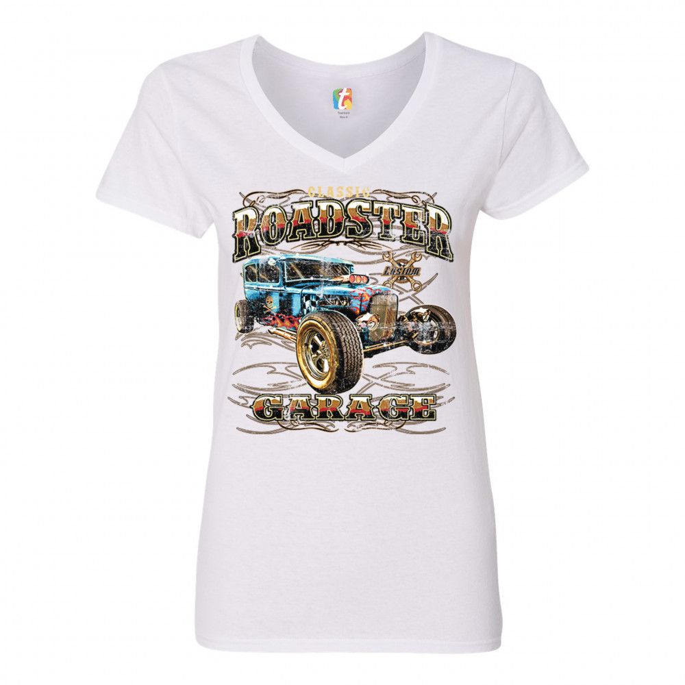 A print featuring a vintage-looking rat rod with flames and a skull with crossbones painted on it's side. "Classic Roadster" is written in the top and "Garage" in the bottom of the print. In the background there is a sign with crossed wrenches which says "custom". Great for Route 66 and hot rod fans.